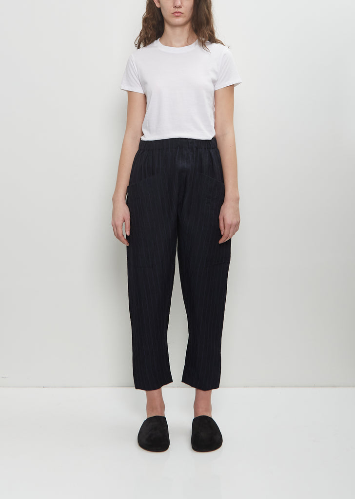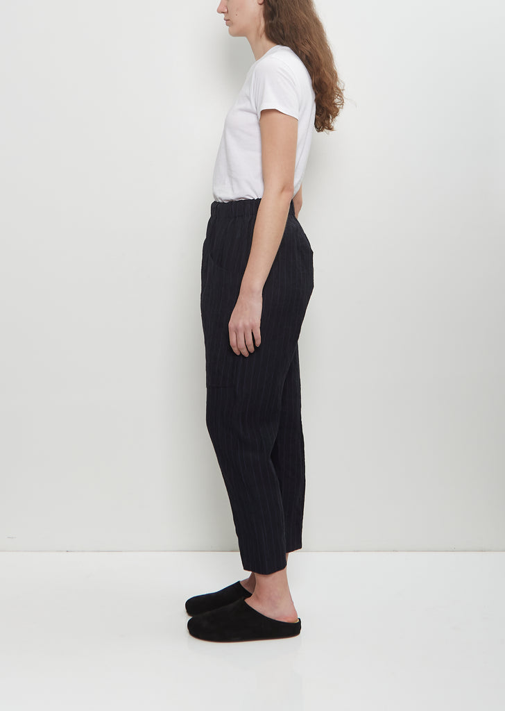 Toogood ink blue stripes drop crotch pull on trouser with tapered, cropped legs in washed textured linen. Features an elasticated waistband, an interior adjustable drawstring at waist and deep patch pockets at front.
