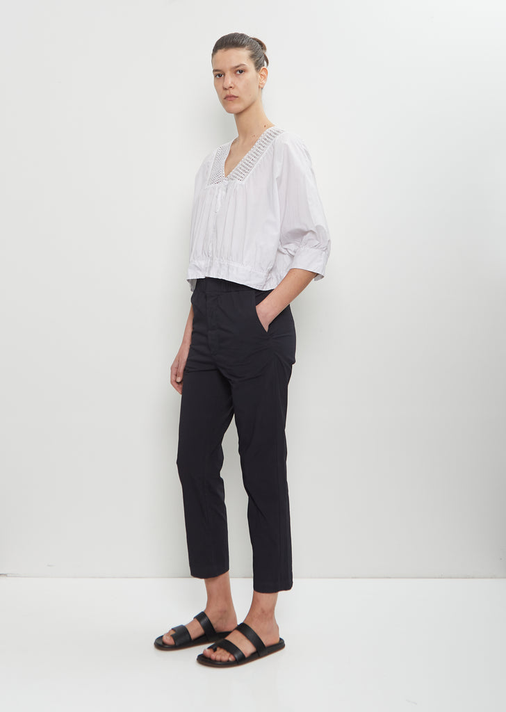 Toujours dark navy cropped trousers with tapered legs and an elasticated waist in a lightweight cotton blend twill. Features angled side pockets, welt pockets at back, and a concealed button-fly fastening. Regular fit.