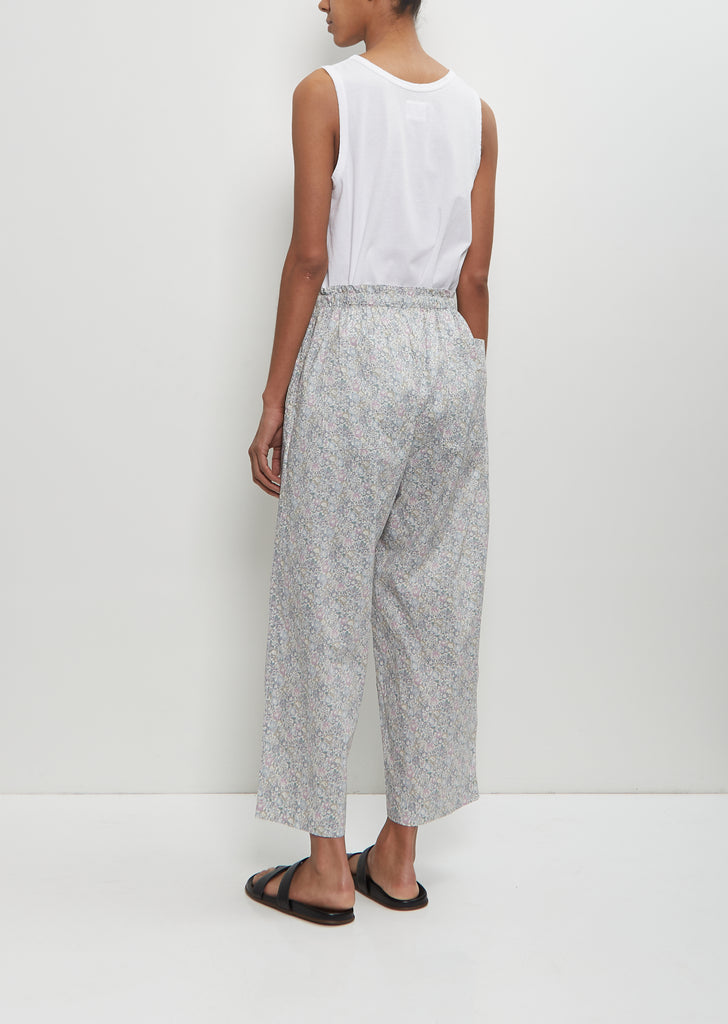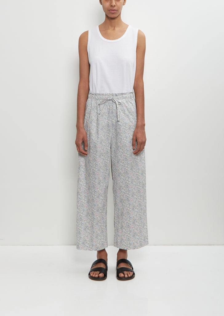 Toujours grey signature pajama pants with cropped, wide legs in floral printed cotton poplin. Features a self drawcord gathered waist, side seam pockets, and patch pockets at back.