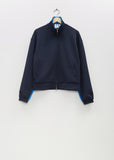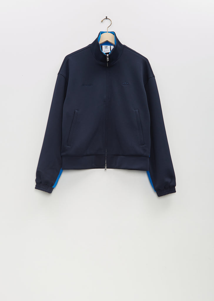 Wales Bonner x Adidas navy track top with a high neck and double zip closure in a stretch recycled interlocking piqué fabric. Features dropped shoulders, angled zippered welt pockets, elasticated cuffs, contrasting bright blue satin panels along sides, sleeves, and interior collar. Embroidered logos at chest. Lined in a burgundy technical fabric.