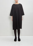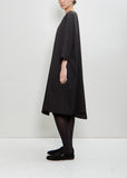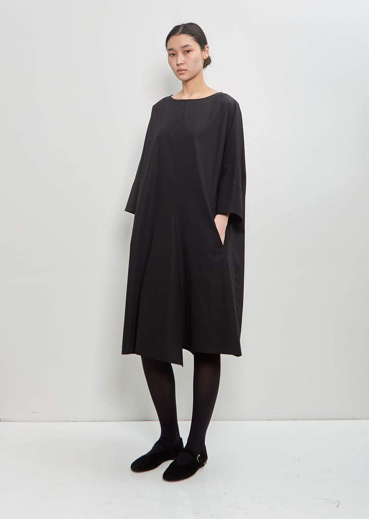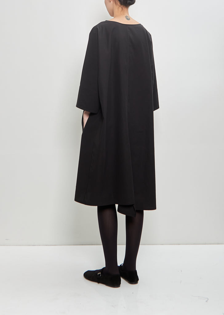 Yohji Yamamoto black oversized pullover tunic dress with a boat neckline and 3/4 length sleeves in crisp cotton poplin. Features dolman sleeves, single welt pocket on left side and asymmetrical hem details at front and back.