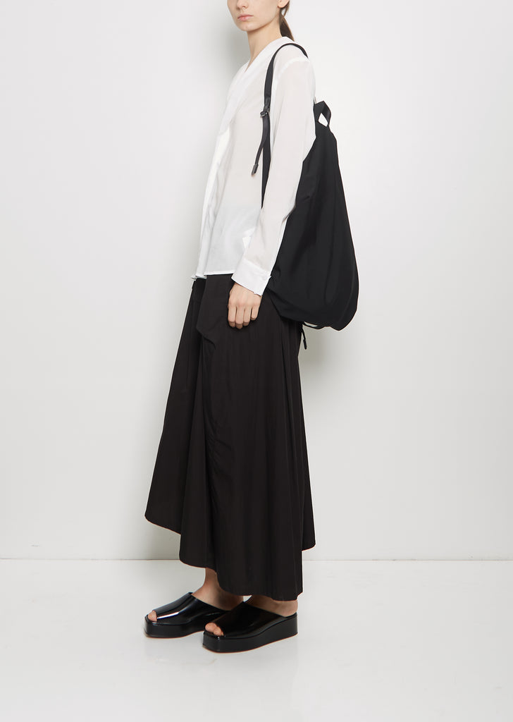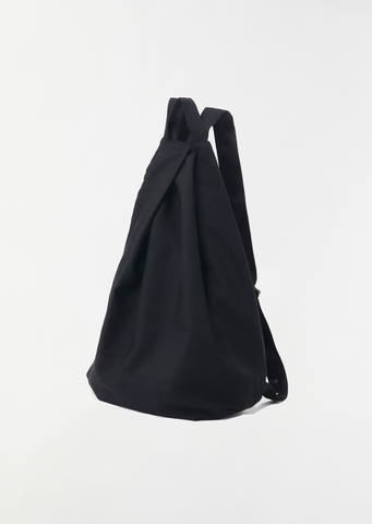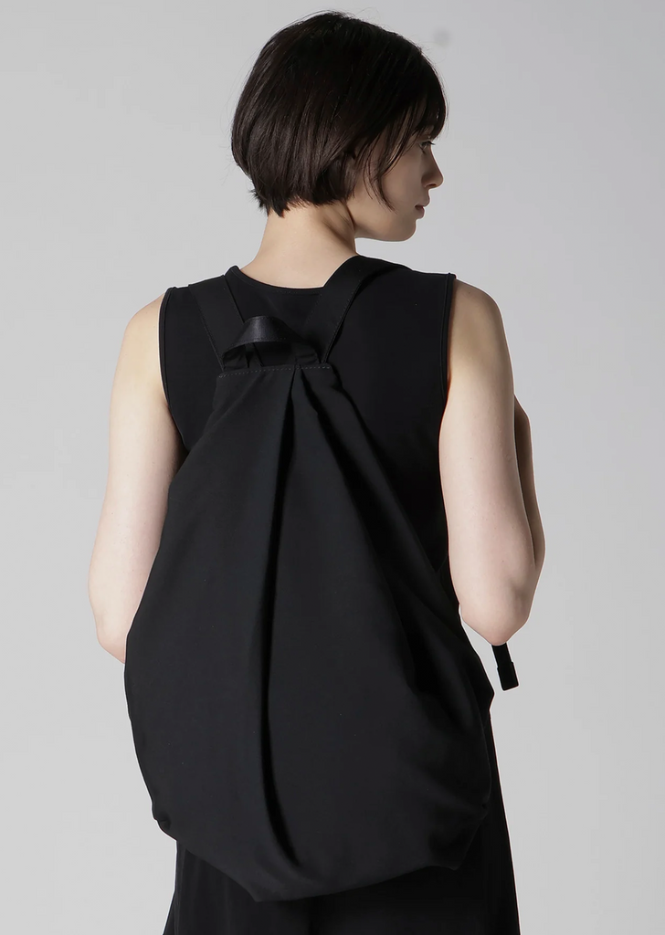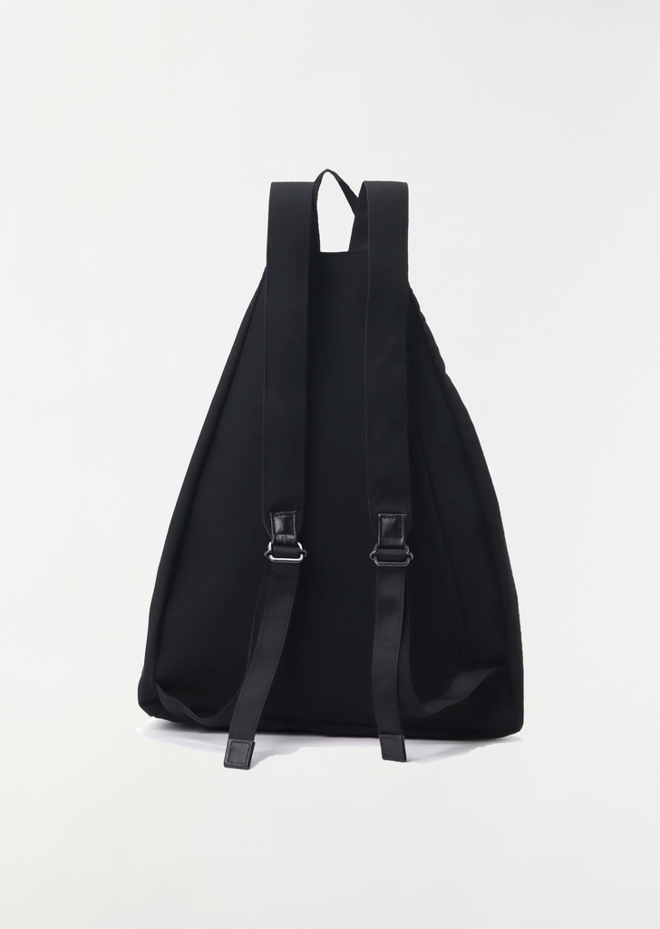 Yohji Yamamoto black pleated backpack with a triangular shape and adjustable shoulders straps in signature wrinkled wool gabardine. Features a top handle, a single interior large zipper pocket and a concealed diagonal zipper closure at back. Lined in tonal technical twill.