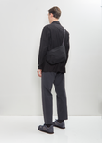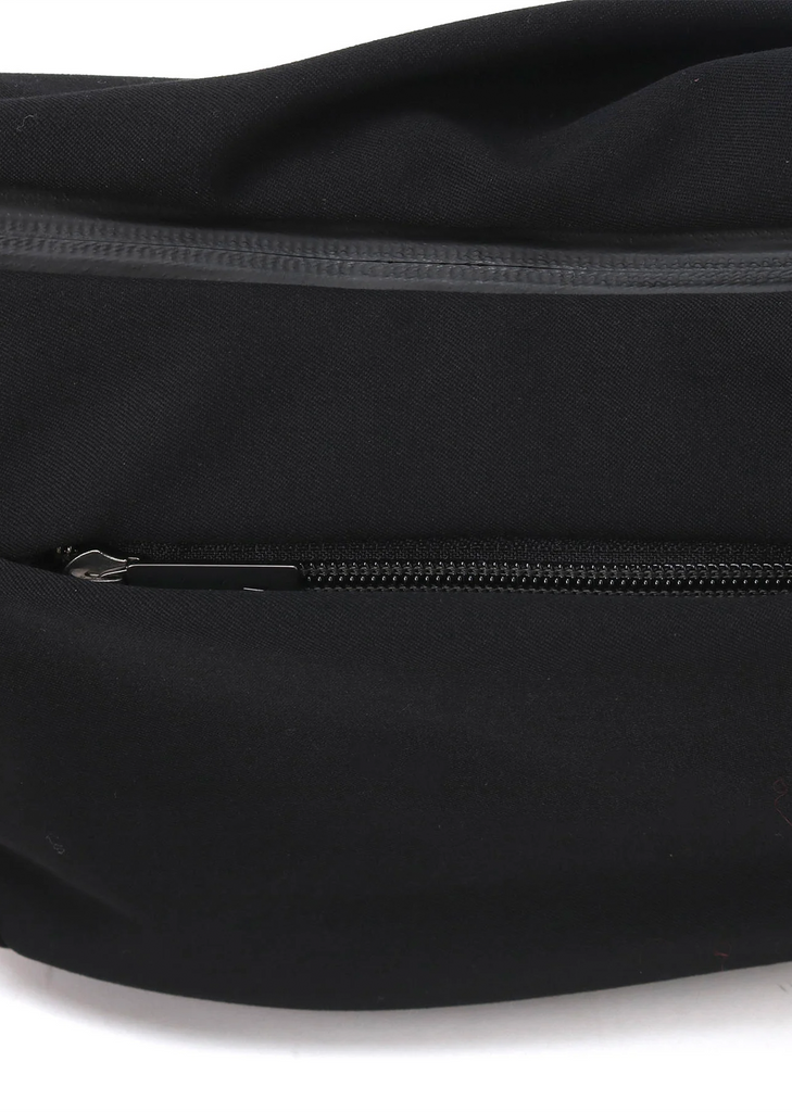 Yohji Yamamoto Pour Homme black crossbody bag with draped silhouette and adjustable shoulder strap in wool gabardine. Features top double zip closure with branded toggles, zip pocket at back, and an interior zip pocket.
