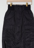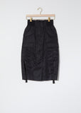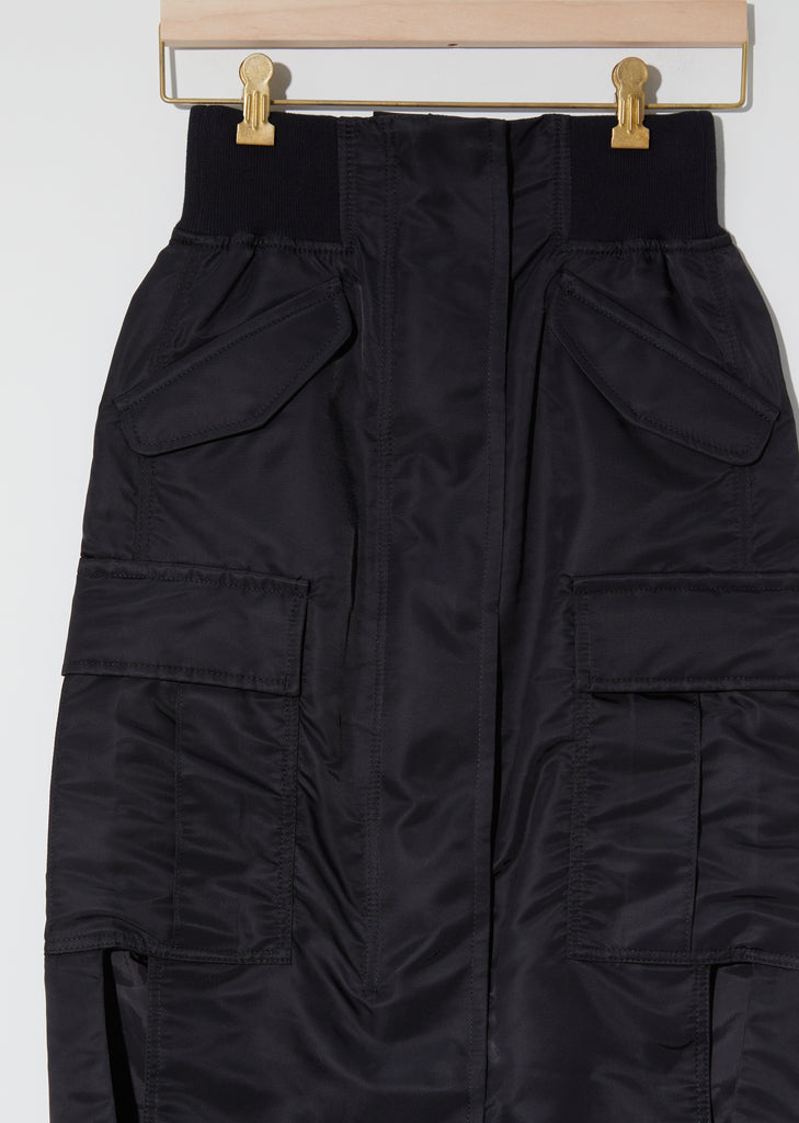 Sacai Nylon Twill Skirt in Black. Signature straight skirt with elastic inset waist and pocket detailing at front and back in a solid black nylon twill. Detailed with loose grosgrain ties at back panel.