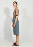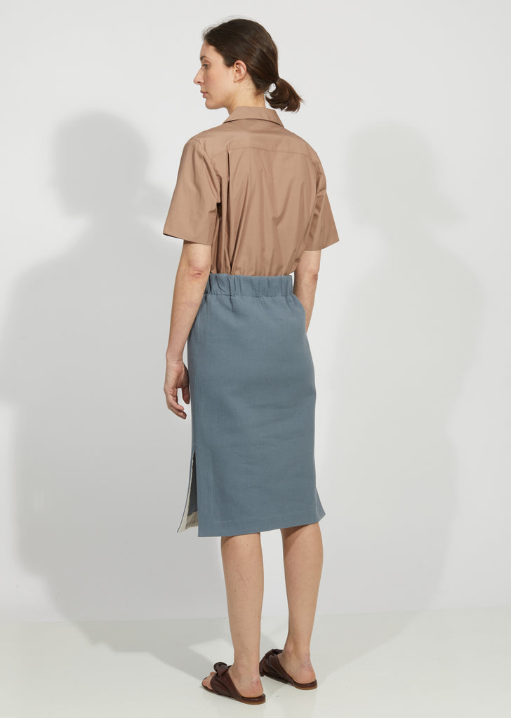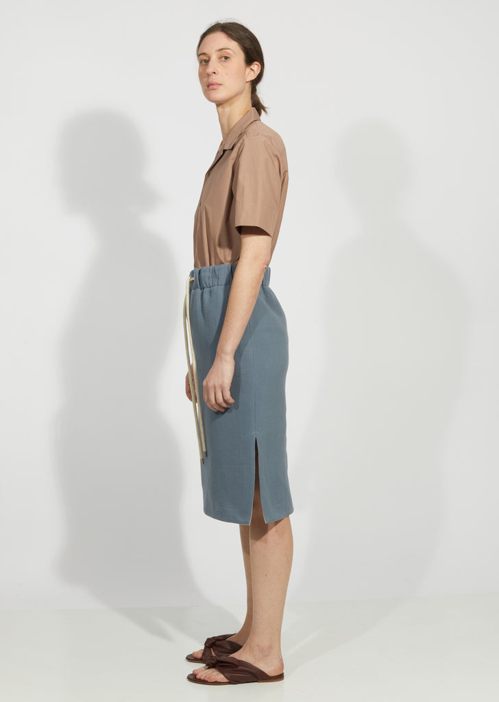 Blue-grey A-line skirt in puckered cotton cloqué, finished with a cased contrast drawstring on a grommet-adorned waist.