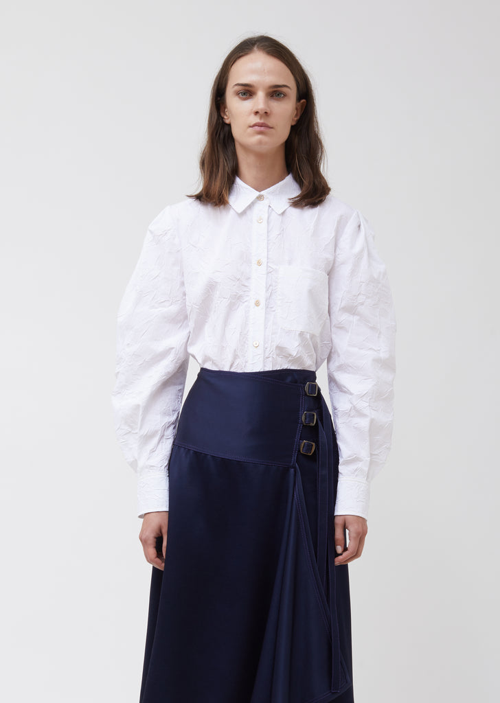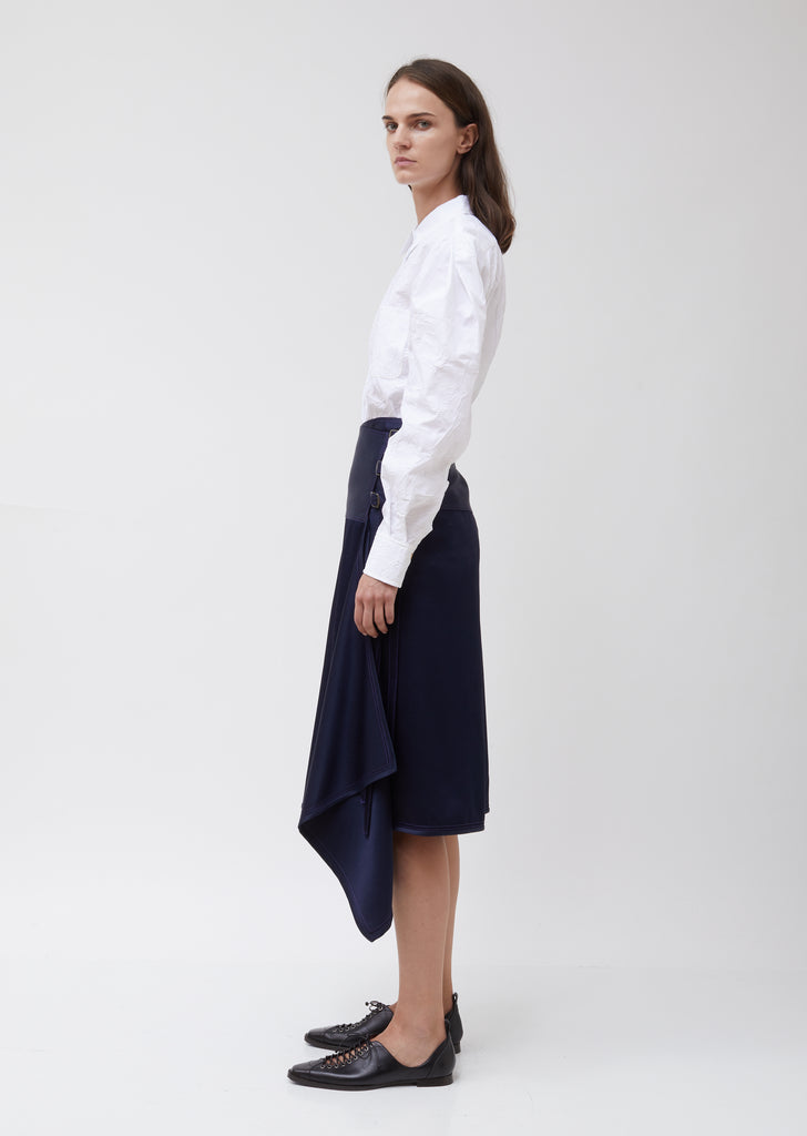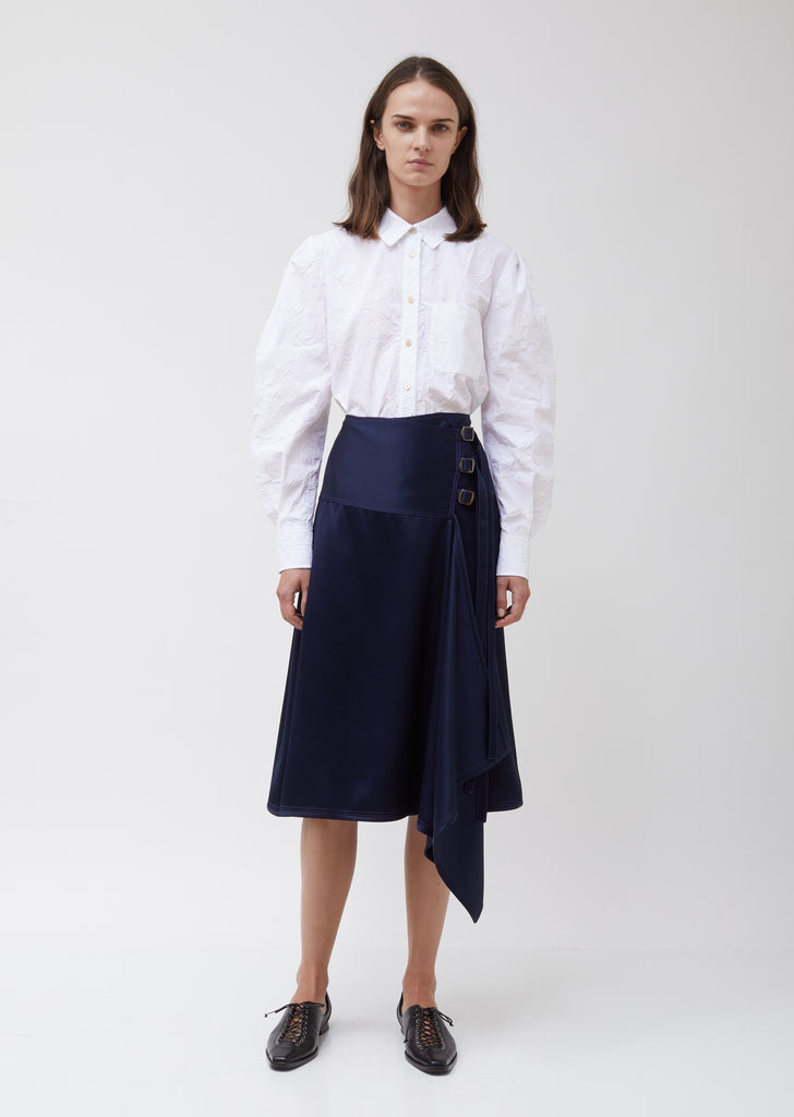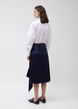 Navy adjustable twill satin blend skirt. Triple-belted waist. Contrast topstitch adds a playful edge while the cascading front ruffle emphasizes the A-line drape and fluidity of the fabric.