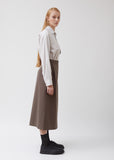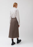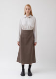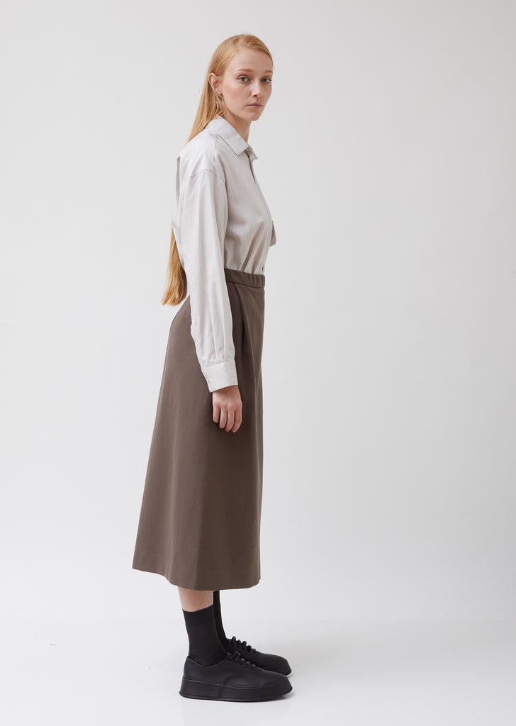 Oak-tone cotton-poplin wrap skirt with tucks and released pleats throughout the waistline. Mid-rise. Slim buttoned set-on waistband. Straight midi hem. A-line silhouette. Classic fit.