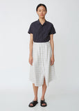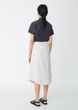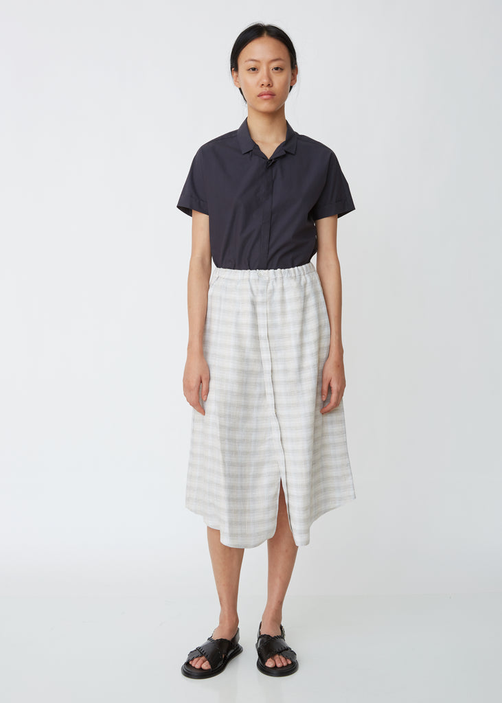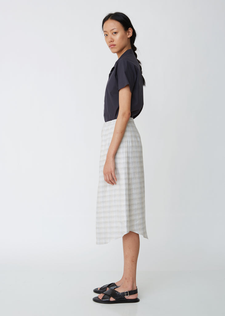 Checked linen Ante skirt from Stephan Schneider. Relaxed knee-length skirt with loose pleating. Pearl-hued button closures along the front. Concealed front pockets. Elasticized waist. Curved hem. Beige lining. Color: Light. 100% Linen. Made in Belgium.