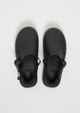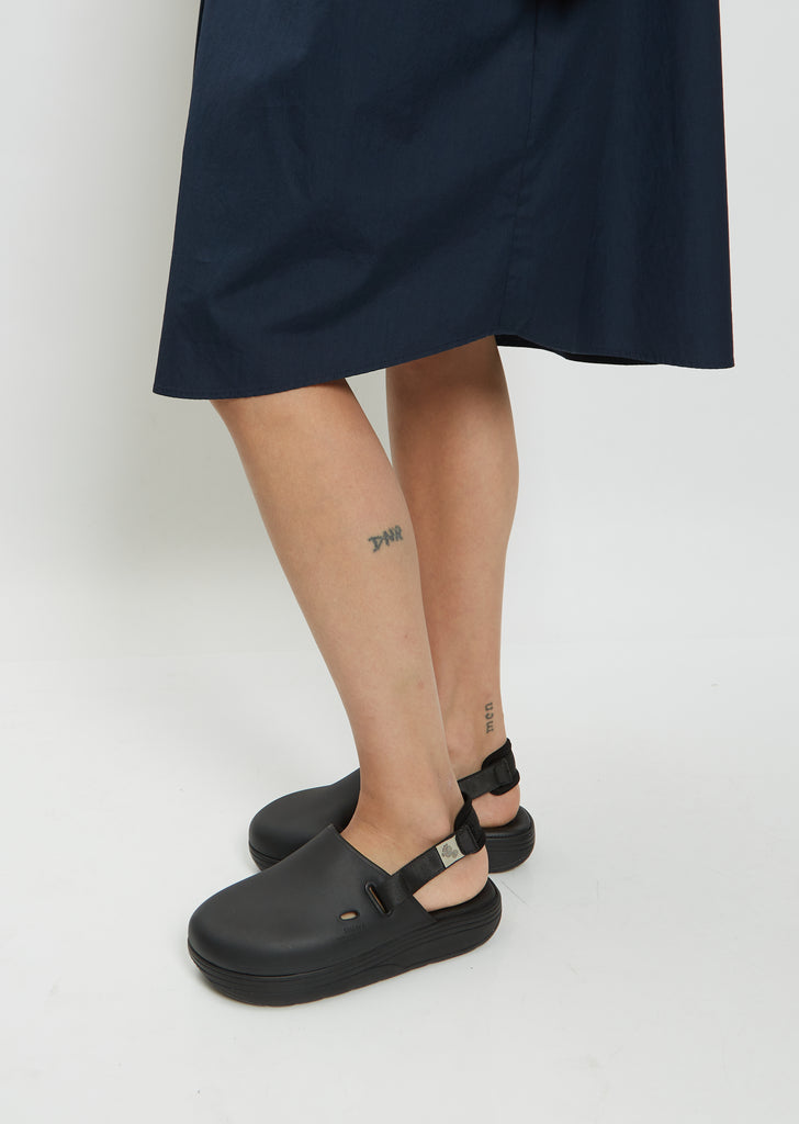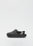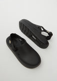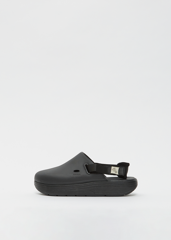 Suicoke unisex black chunky clog with an adjustable back ankle strap in Suicoke signature EVA rubber.