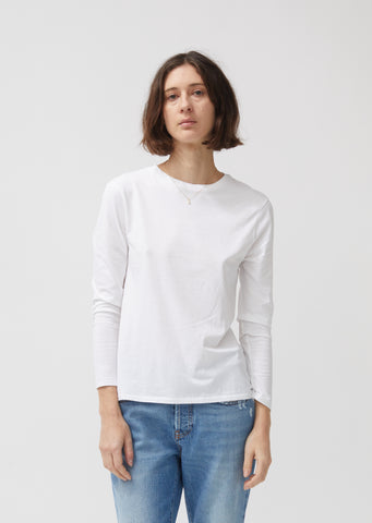 Long-sleeve T-shirt in soft white Pima-cotton jersey. Ribbed crewneck. Straight hem. Fitted throughout. Standard fit.
