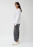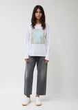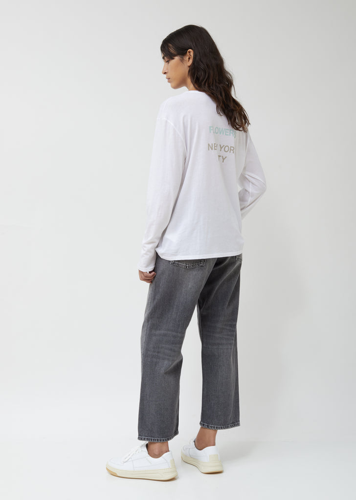 Long-sleeve crewneck T-shirt in soft white Pima-cotton jersey, screen-printed at the front with an aquamarine-and-taupe abstract floral design. The words "FLOWERS NEW YORK CITY" appear in the same colors at the upper back. Pulls over. Drop shoulders. Slightly exaggerated sleeves. Straight hem falls to lower hip. Straight, relaxed fit.