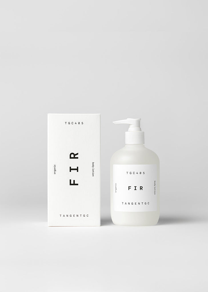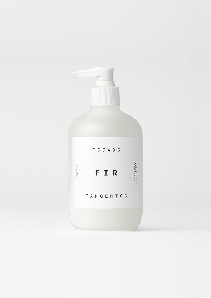 TangentGC fir perfumed organic body lotion — crafted with pure vegetable lipids. The Siberian fir, native to the taiga east of the Volga, smells compelling where it stands. Pressed between your fingertips, the needles release a balsamic wood aroma as well as a resounding top note with crisp, fleeting pinene.