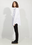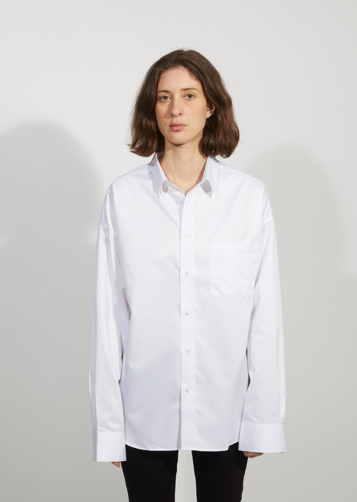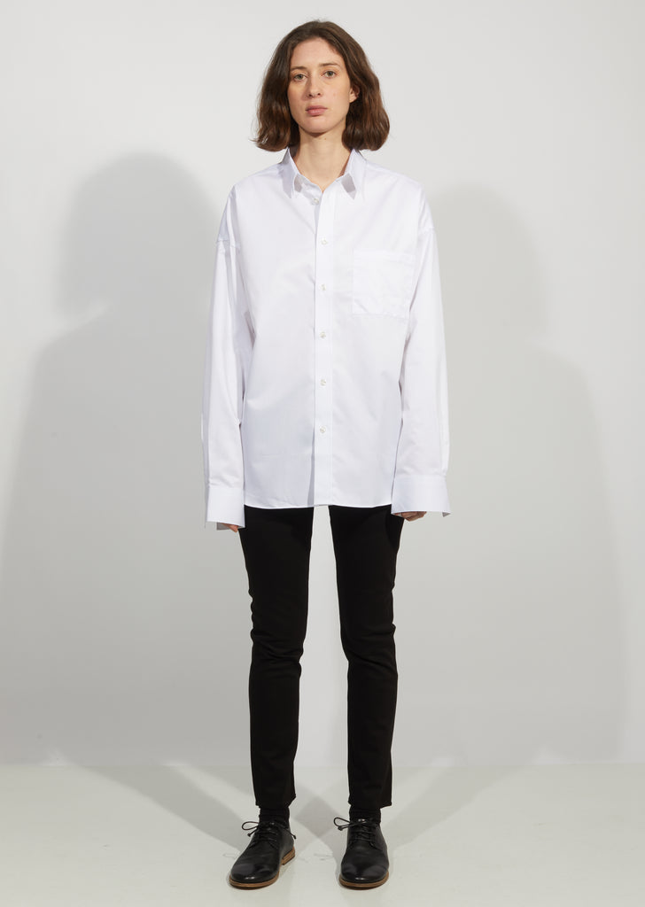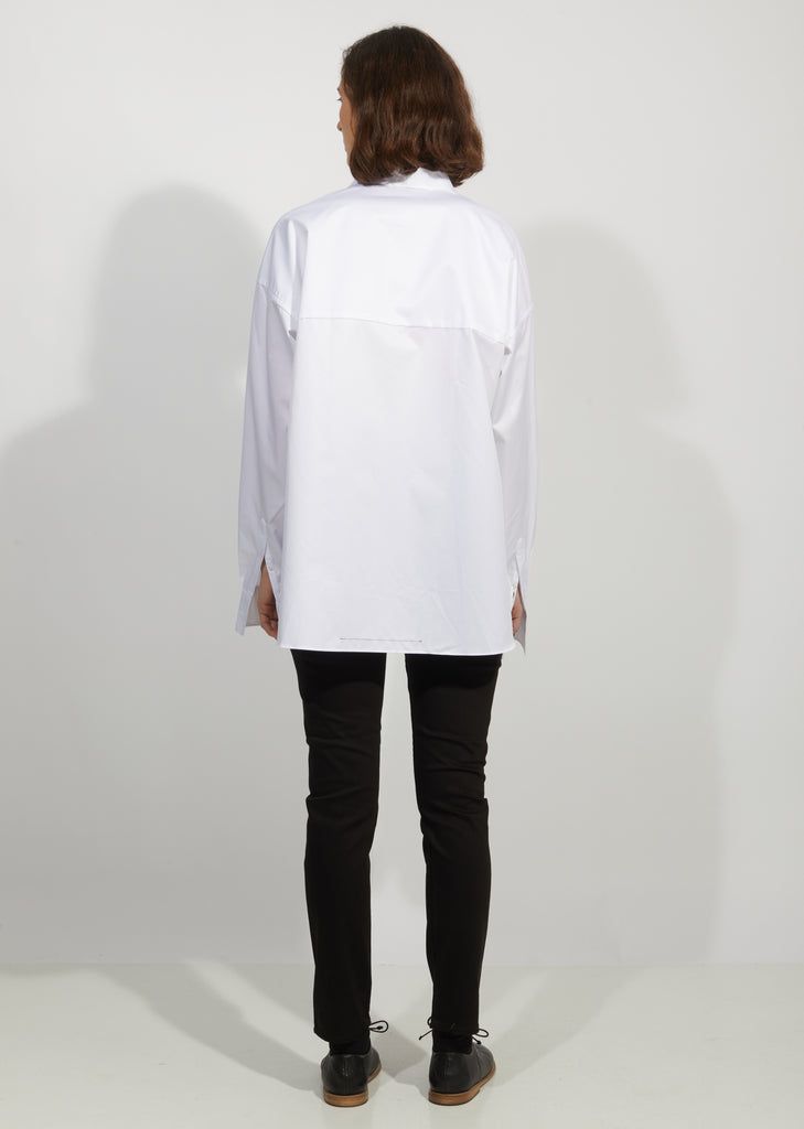 White unisex long-sleeve shirt in mercerized cotton poplin, imagined with slouchy drop shoulders, exaggerated sleeves, and a deep back yoke.