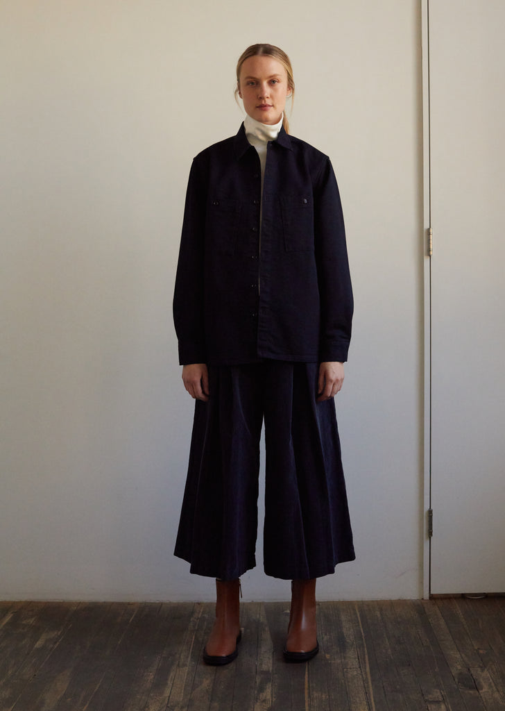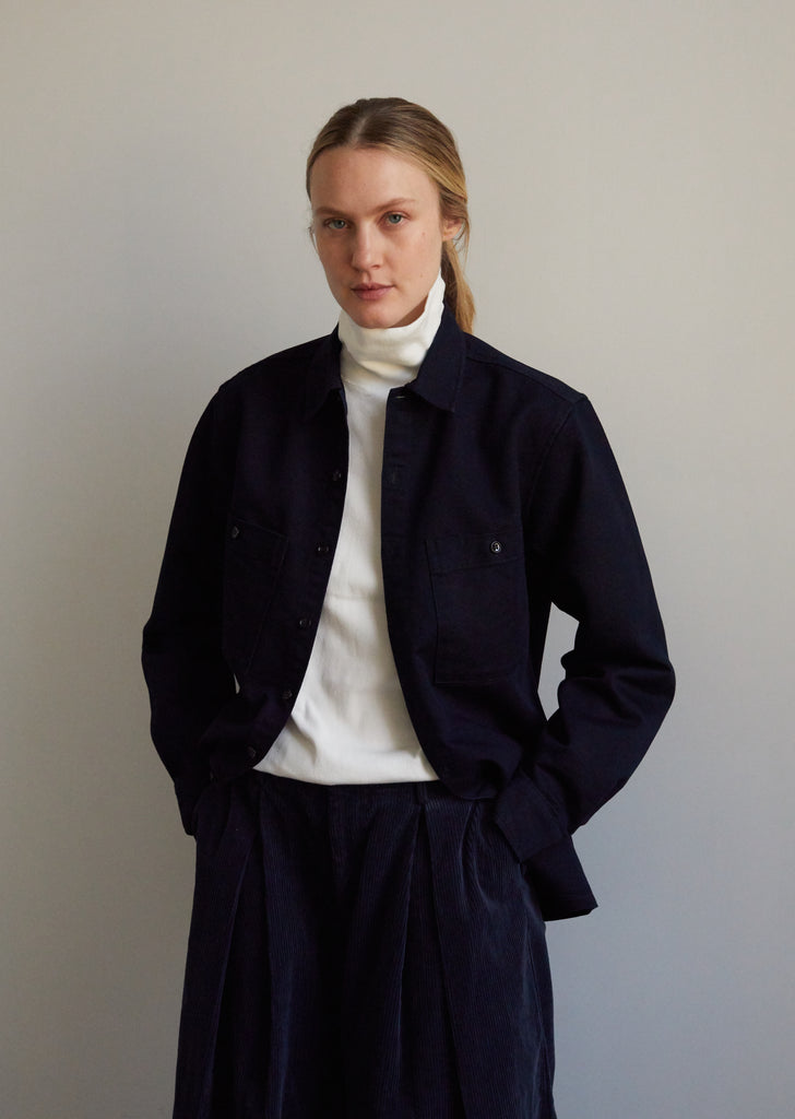 Long-sleeve button-front shirt imagined in indigo felted cotton-blend twill, finished two large button-through patch pockets at the chest. Spread collar. Single-button cuffs. Sleeve vents. Tonal buttons. Back shoulder yoke. Slight droptail hem. Straight, oversized fit.