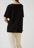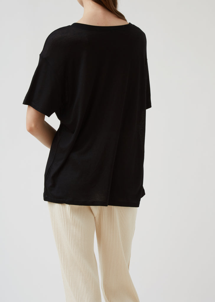 Loose-fitting black short-sleeve T-shirt rendered in a veil-like bamboo textile, chosen not only for softness, but also for its ability to minimize the appearance of stitching lines. Boxy silhouette. Jewel neck. Slightly dropped shoulders. Straight hem. Upper-thigh length.