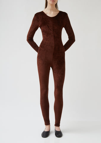 Balletic deep-brown unitard constructed from a lustrous second-skin stretch velour. Slip-on style. Crewneck. Deep scoop back. Long sleeves. Ankle length. Tight fit.