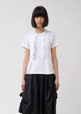 White cotton-jersey short-sleeve T-shirt adorned with two vertical bands of ruffle trim. Crewneck. Short sleeves. Released tucks at front waist. A-line silhouette. Straight hip-length hem. Classic fit.