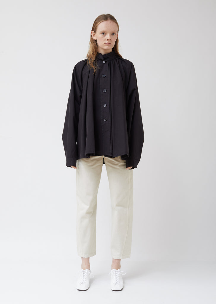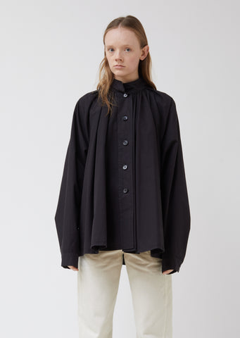 Black cotton-poplin with a gathered neckline that drapes into soft folds at the front and back of the garment. Band collar. Long balloon sleeves. Button barrel cuffs. 3/4 button front. Tonal buttons. Straight hem hits lower hip. Slight A-line silhouette. Generous fit.