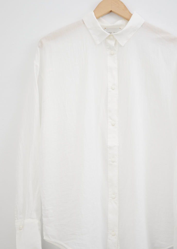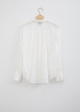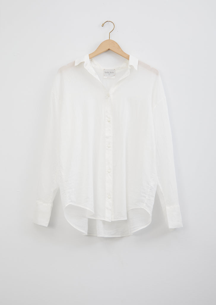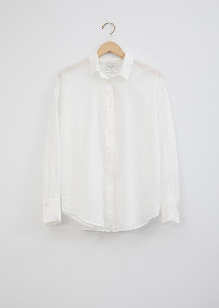 Forte Forte Crochet Buttons Shirt in white. Crafted in Italy with a cotton and silk blend fabric, this lightweight and flowy shirt has a loose, relaxed fit, and features custom crochet buttons at front and sleeve placket. Gathering detail at back yoke adds volume to back. We recommend wearing it thrown back for a laid-back look and feel (as shown in last image)