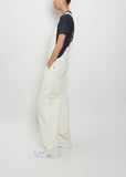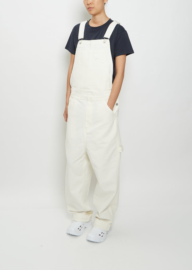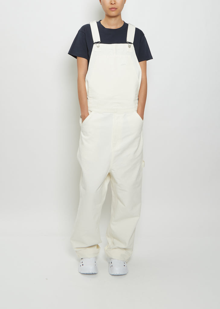 Toogood x Carhartt WIP unisex white sleeveless farmer bib overalls with a kangaroo pocket in an organic cotton canvas.