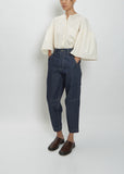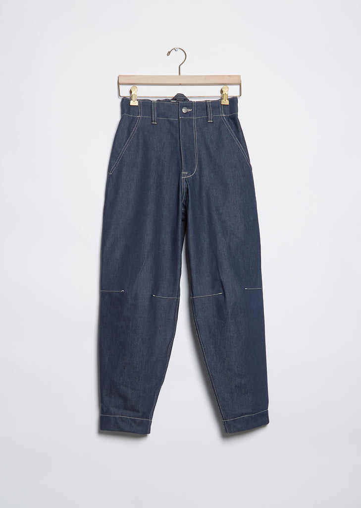 Toogood unisex indigo flat front tapered, cropped leg jean with darts at the knee in a rigid organic cotton denim.