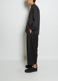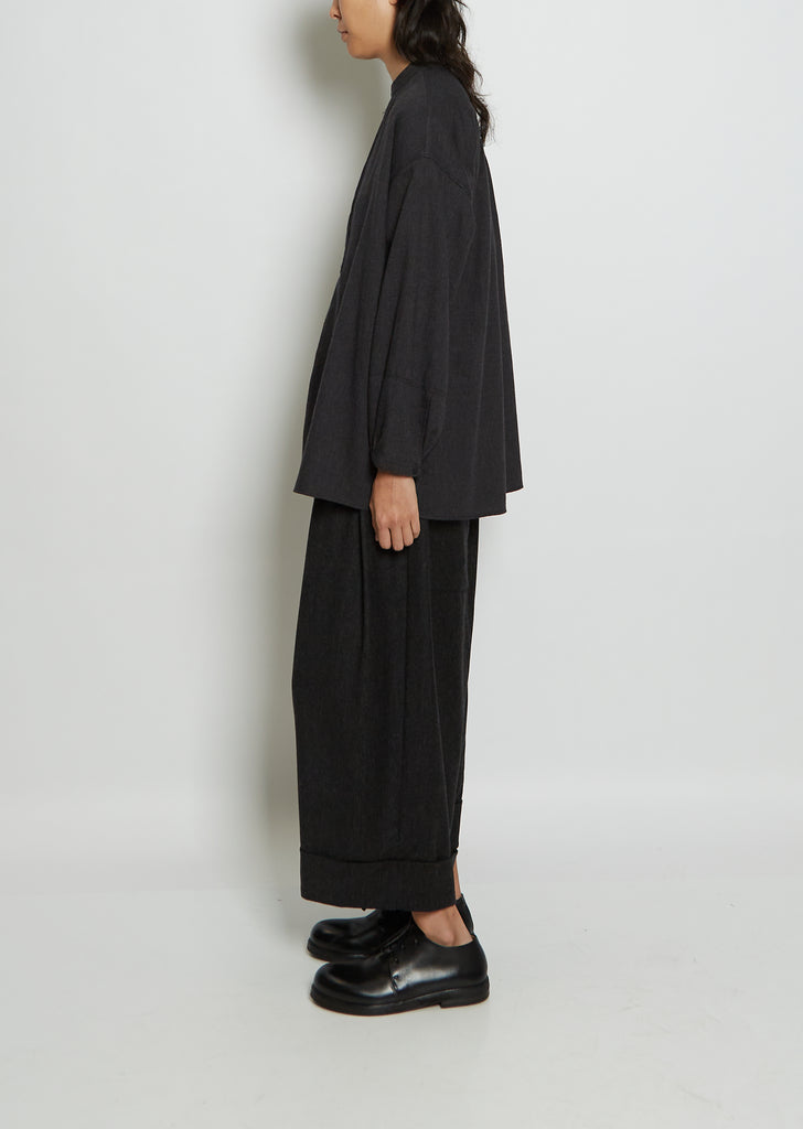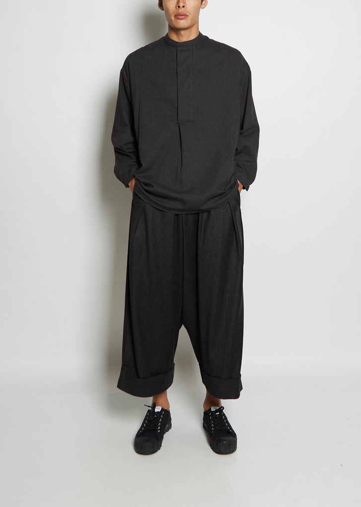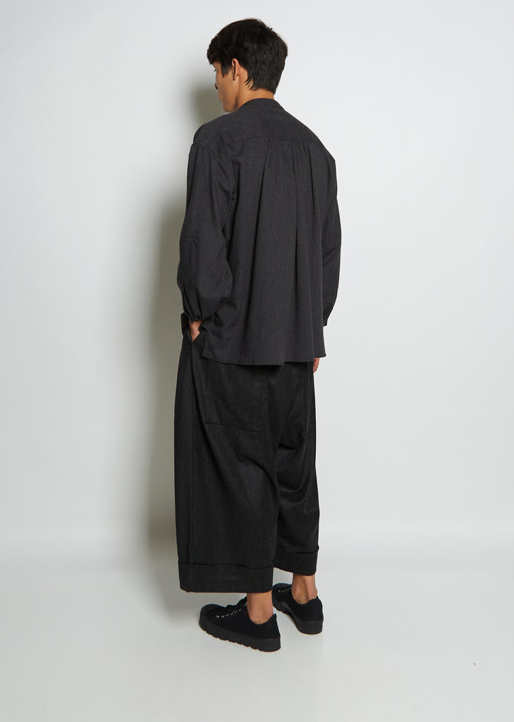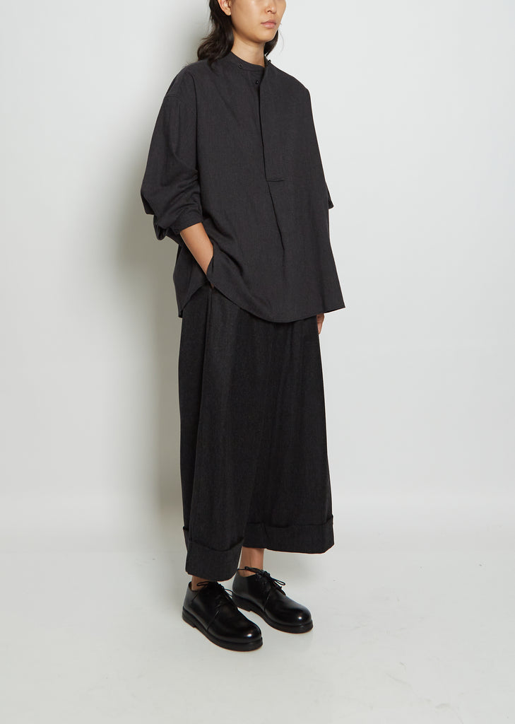 Toogood unisex pewter grey popover shirt with a mandarin collar and concealed half placket in a soft brushed cotton twill. Features dropped shoulders, elasticated sleeve cuffs and small side slits.