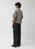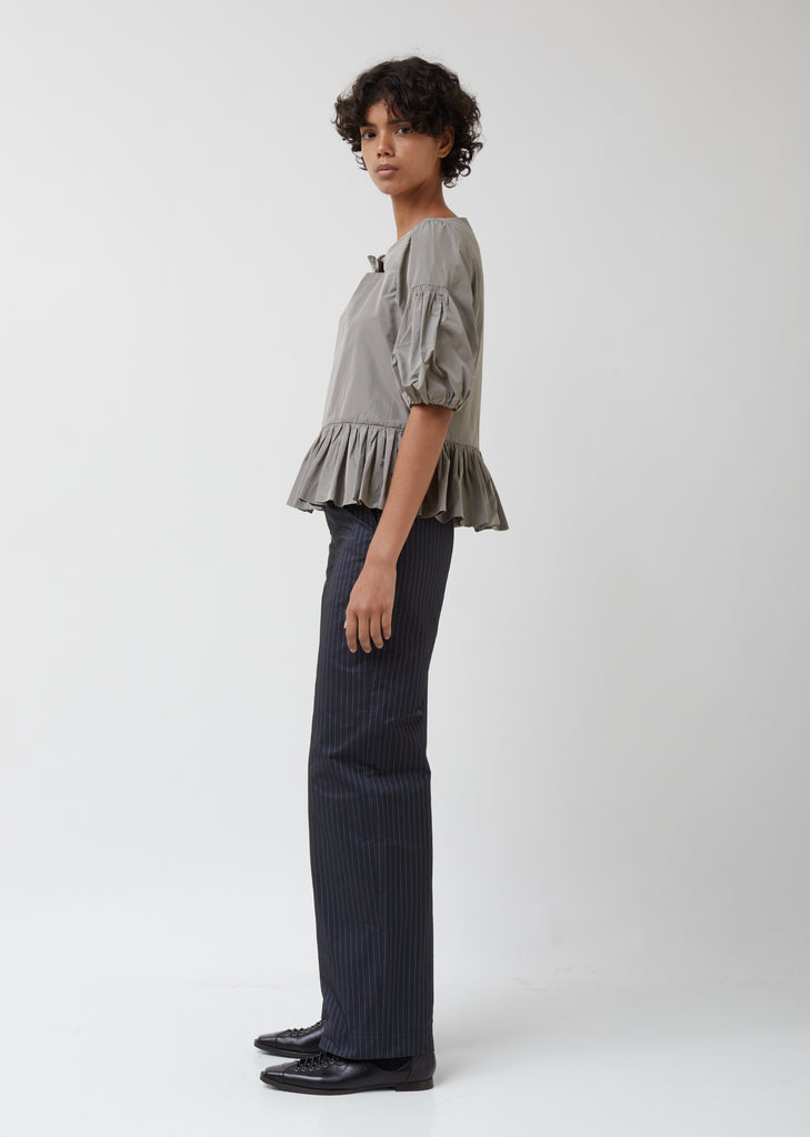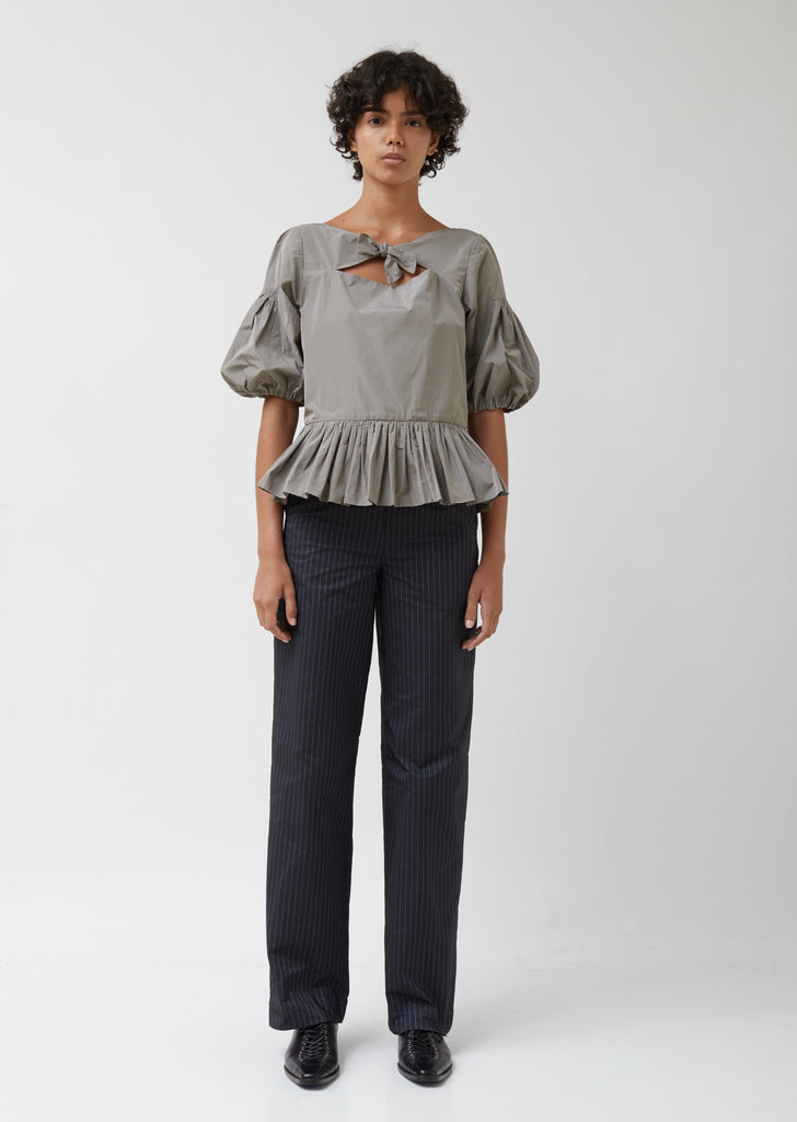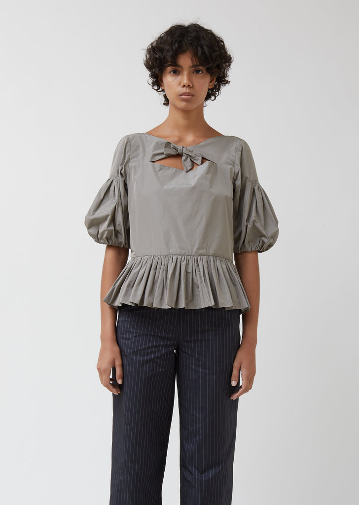 Grey tech-crêpe peplum top accented with a tie neck that creates a bateau contour above and a cutout detail below. Half puff sleeves. Concealed back zip. Gathered, ruffled peplum waist. Hip-length hem. Straight fit.