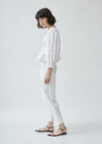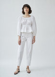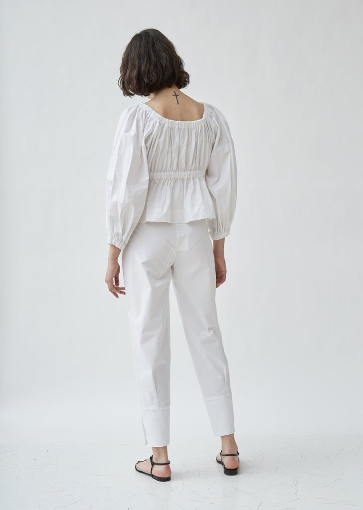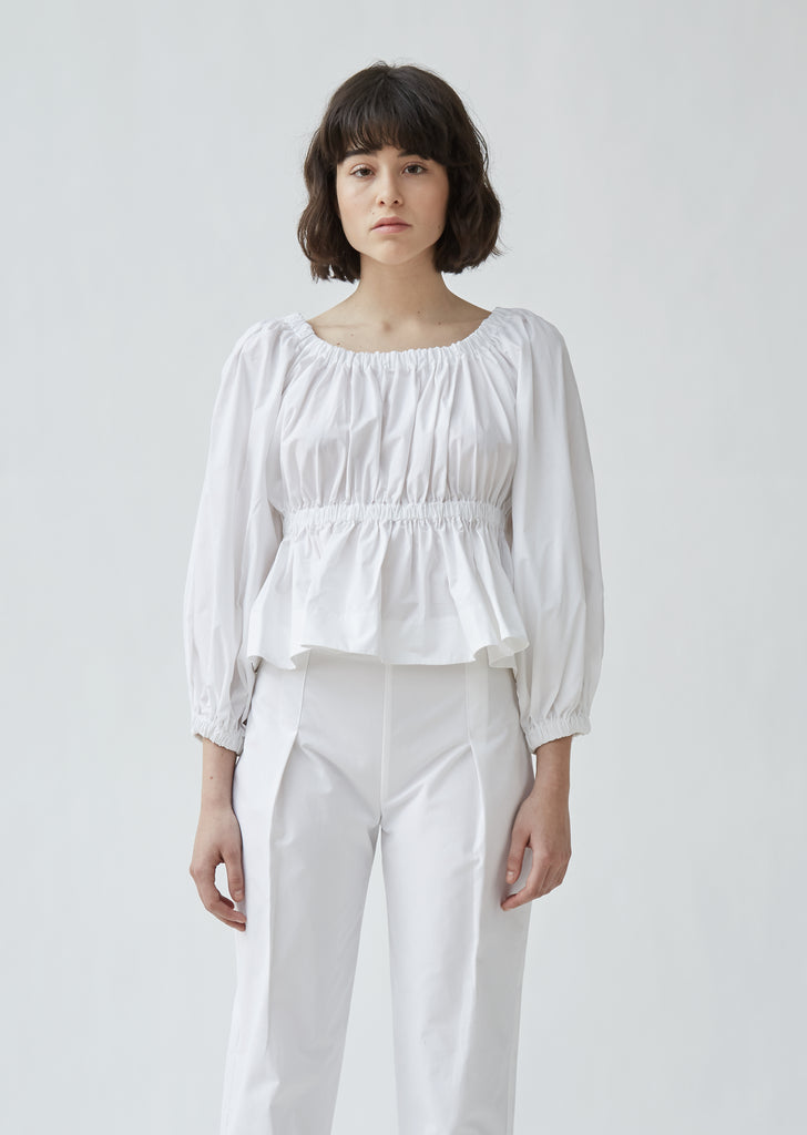 Signature empire waist cotton blouse with ruched neckline and balloon sleeves in a crisp, cotton broadcloth. Elastic trim around neckline, waist and sleeve hem for easy pullover fit. Regular fit.