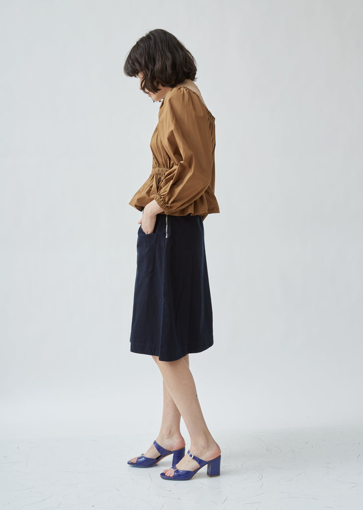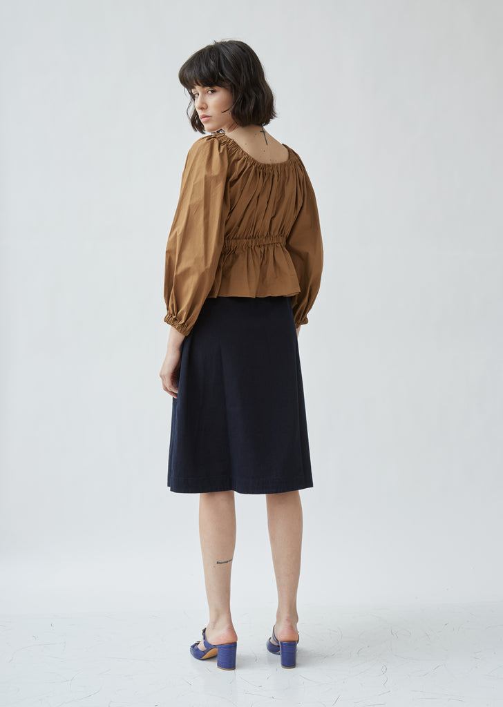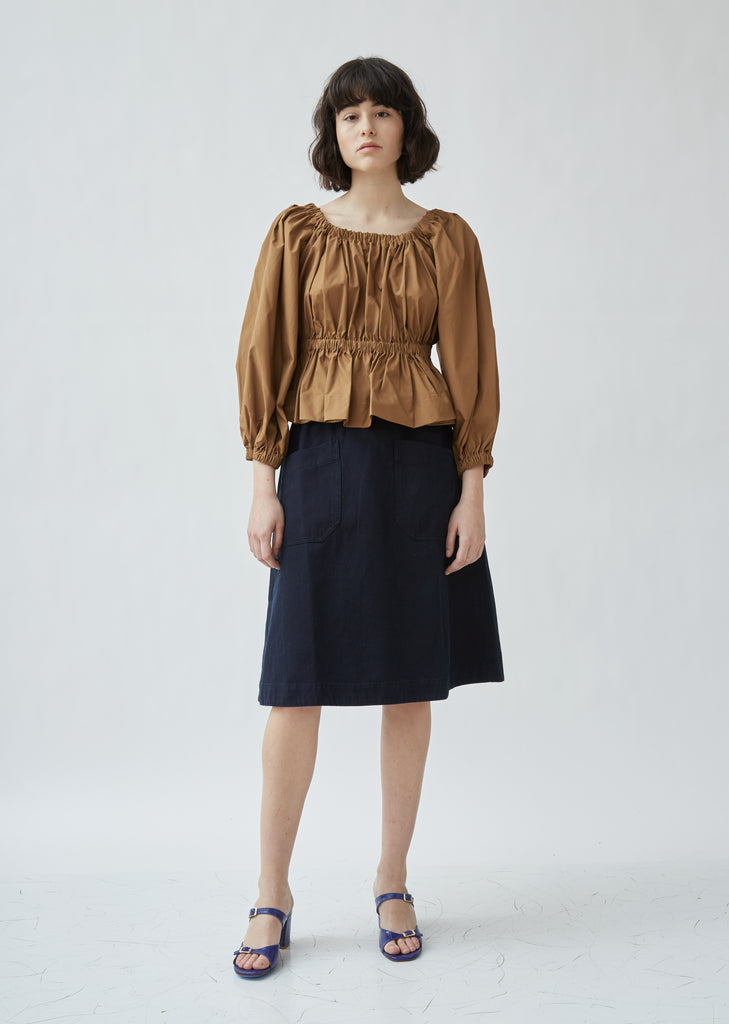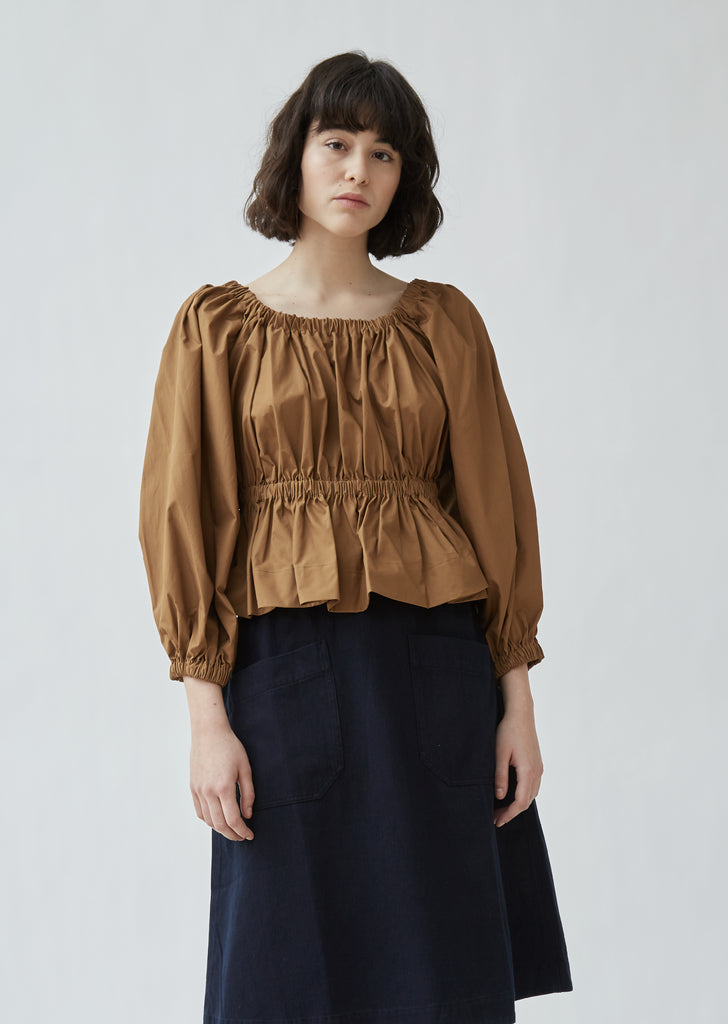 Signature empire waist cotton blouse with ruched neckline and balloon sleeves in a crisp, cotton broadcloth. Elastic trim around neckline, waist and sleeve hem for easy pullover fit. Regular fit.
