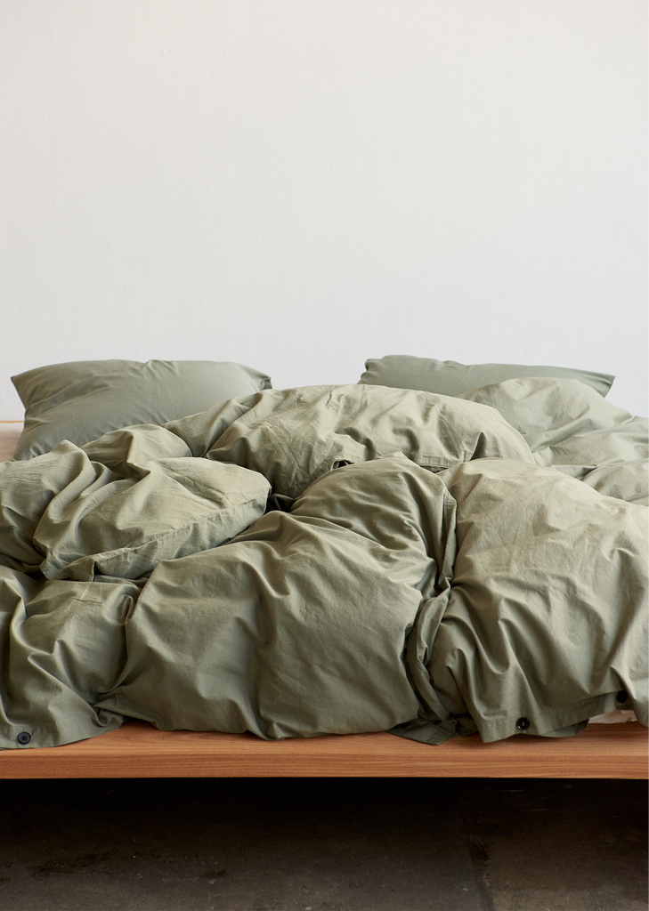 Tekla deep faded green king size percale duvet cover is designed to provide the feel of freshly washed sheets, day after day. Woven using extra-long yarns, the duvet cover will gently soften over time without pilling and guarantees a deep, pure colour even after years of use.