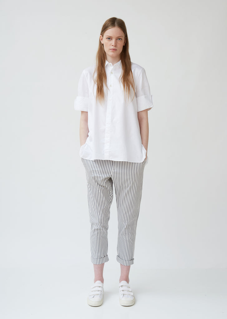 This mindful update of the crisp summer button-up includes a sloped A-line silhouette and a geometric crossed yoke on the back. From HOPE, the Stockholm-based label that strives to create "tomorrow's classics," with a focus on responsibly produced staples and unisex shapes. Point collar. Front button closure. Short sleeves; split fold-up cuffs. Inverted-V-shaped cross yoke at back. Hem is higher in front than in back. Color: White. 100% Cotton. Machine wash. Imported.