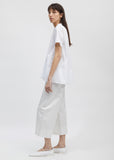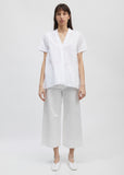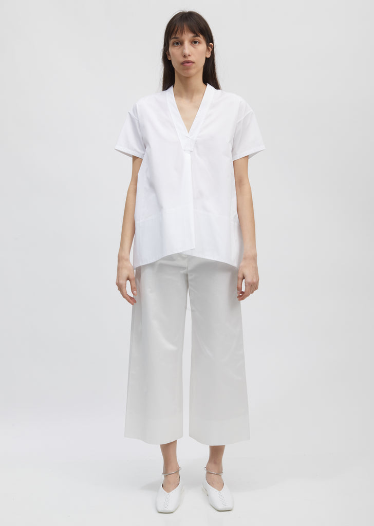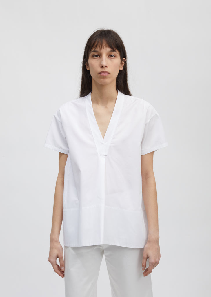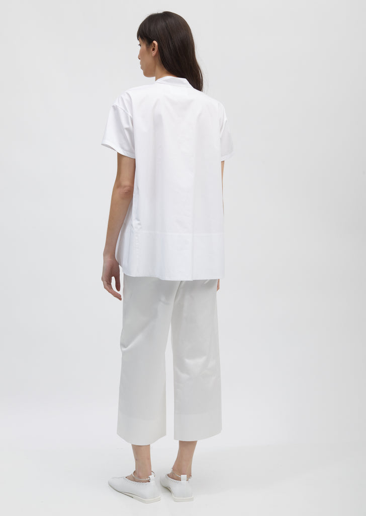 Pure white cotton blouse in Egyptian poplin shirting with small box pleat below neckline and subtle trapeze shaping at back. Versatile piece for daily wear.