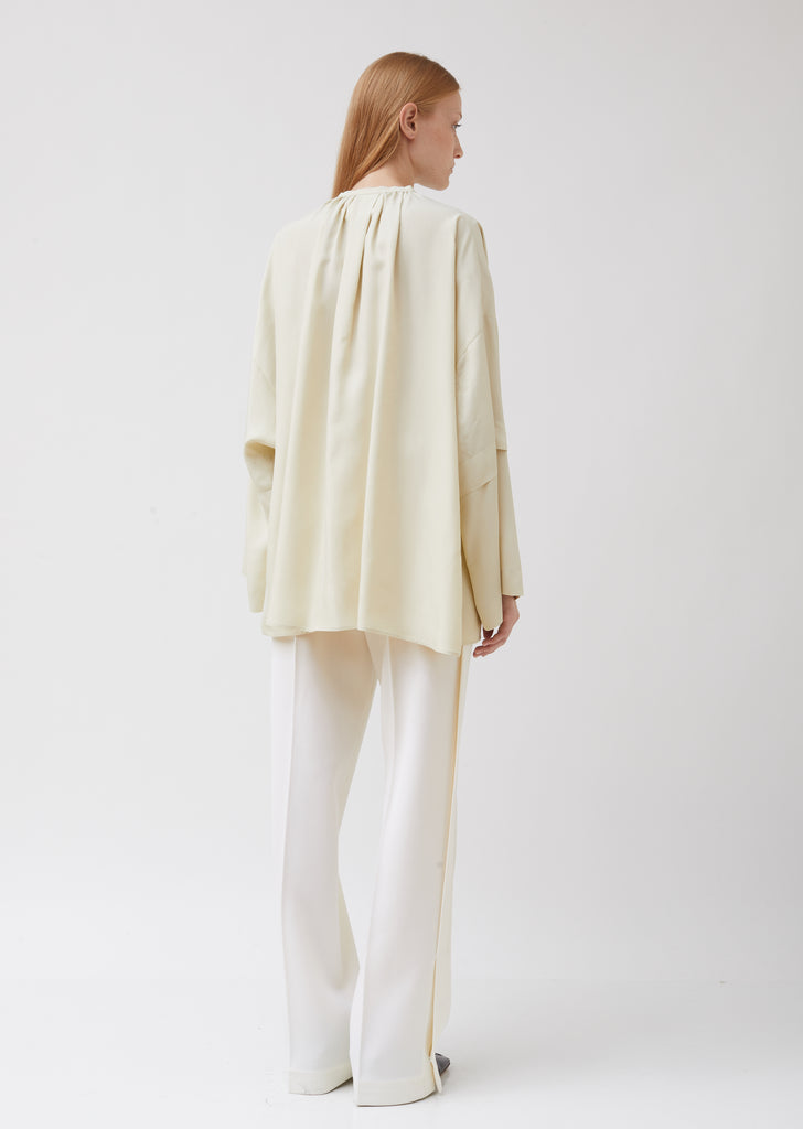 Off-white silk-blend-broadcloth blouse finished with a round gathered neckline, tiered kimono sleeves, and a concealed button placket. Single box pleat at nape. Fabric drapes into soft folds. Wide hem hits top of thigh. Oversized fit.