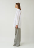 Semi-lustrous white cotton-poplin band-collar shirt in menswear-inspired proportions. Button front style with a detachable mandarin collar. Long sleeves. One-button barrel cuffs. Back shoulder yoke with box pleat. Elongated shirttail hem. Slightly oversized fit.