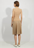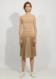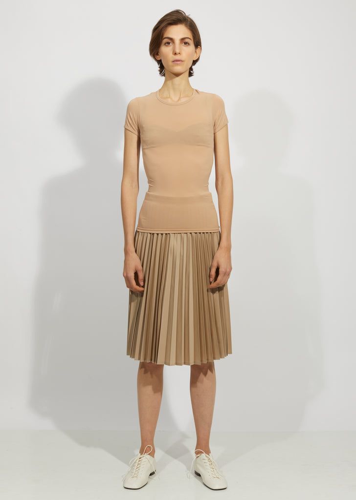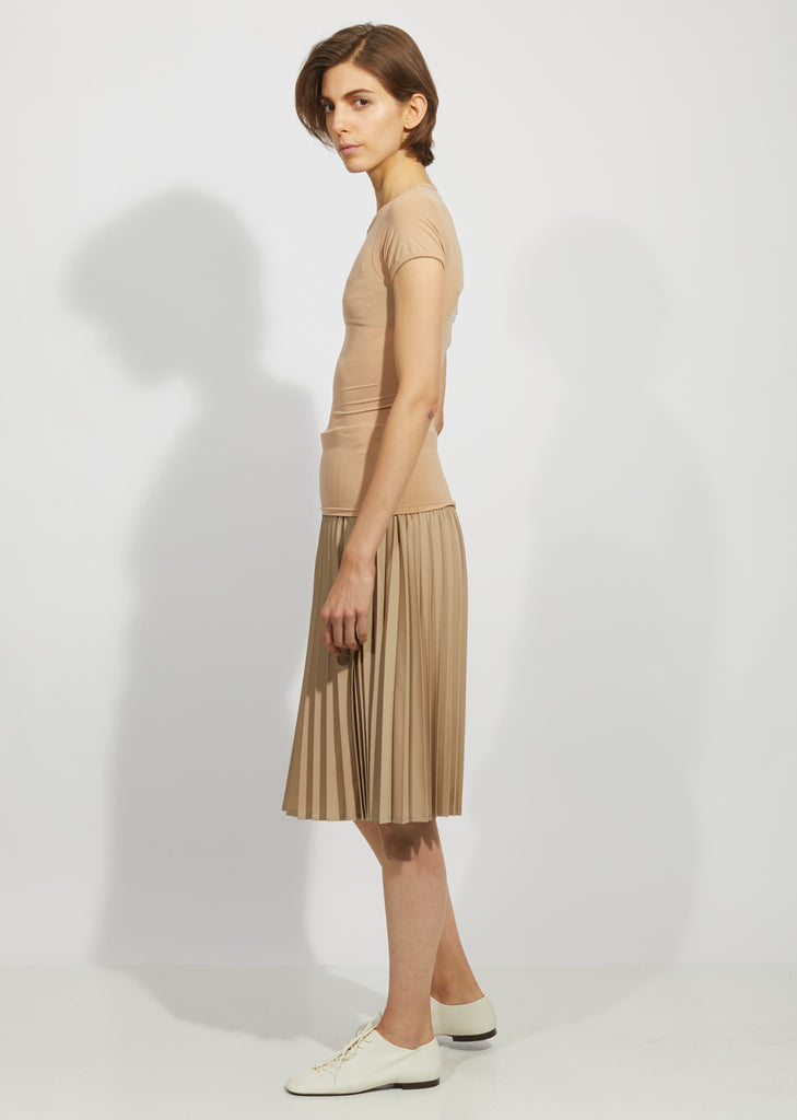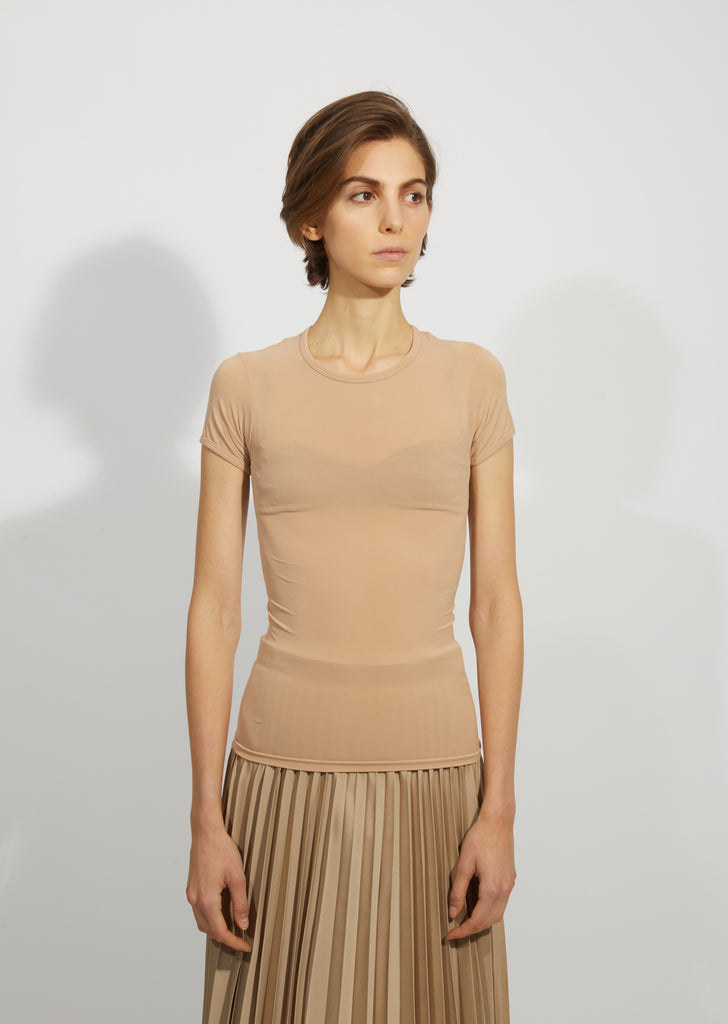 Beige nylon jersey t-shirt with a scoop neck and short sleeves. This body conscious piece stretches for a close fit.