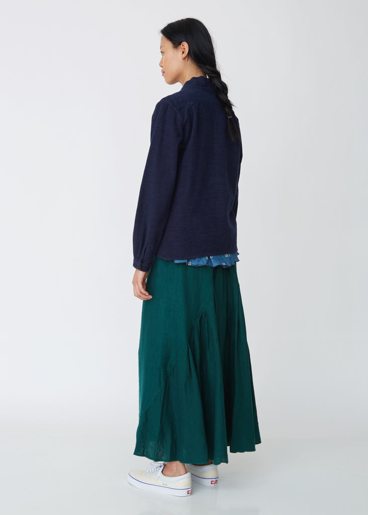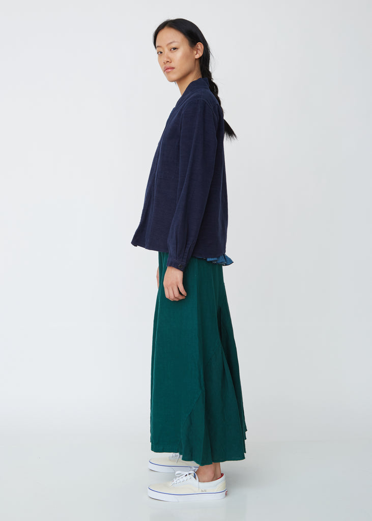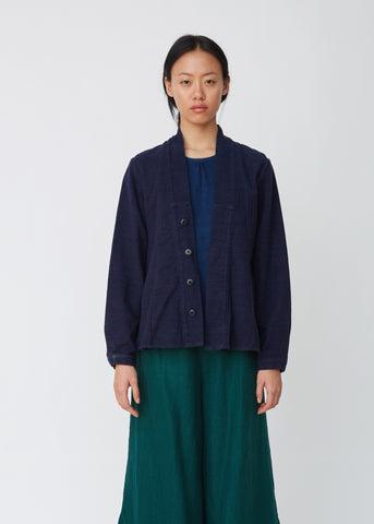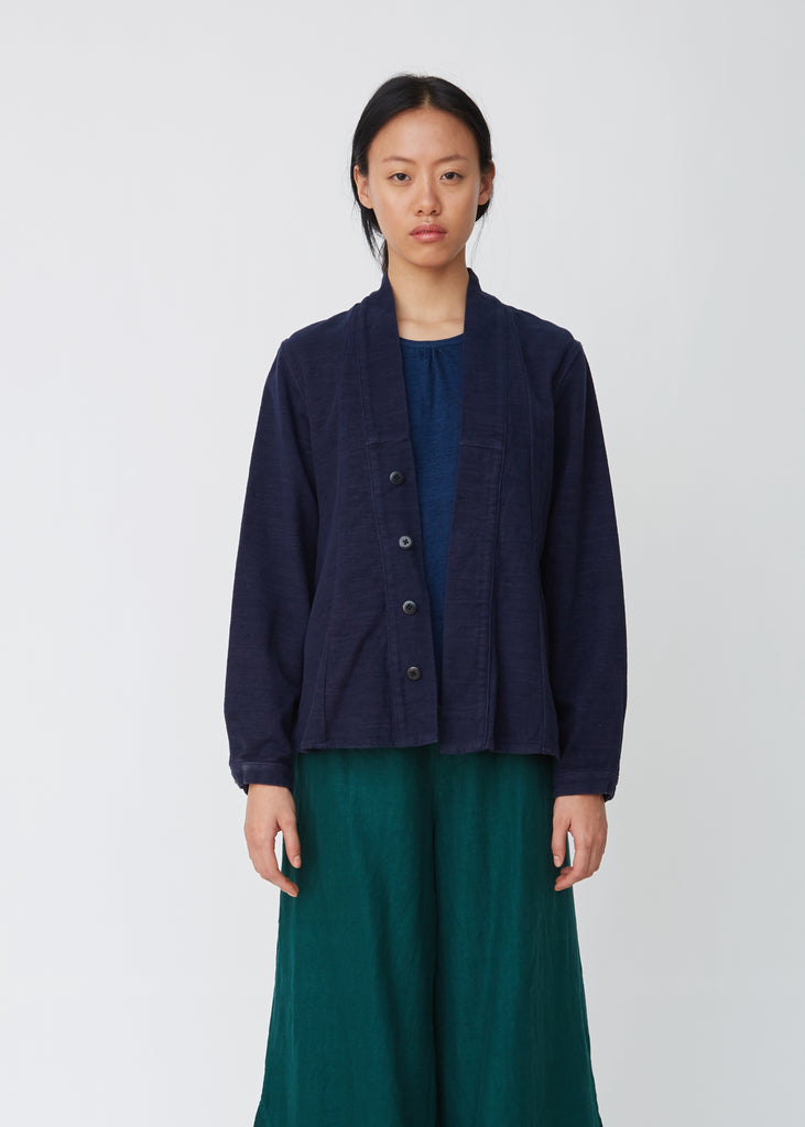 Kapital's indigo-dyed navy Bonze Hiyoku shirt jacket in soft brushed cotton. Designed with a kimono-inspired relaxed silhouette, this jacket features a concealed front button placket for a clean look. Neat darting gives this piece its refined shaping. Finished with subtle pleating at the button cuffs, side splits at the hem, and mauve cotton lining. Color: Navy. 100% Cotton. Made in Japan.