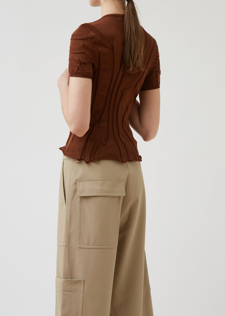 Brown stretch-tech-jersey short-sleeve T-shirt with a stitched-in carved-swirl design. Crewneck. Rib-trim neck and sleeves. Gently ruffled hem. Hip length. Tight fit.