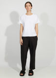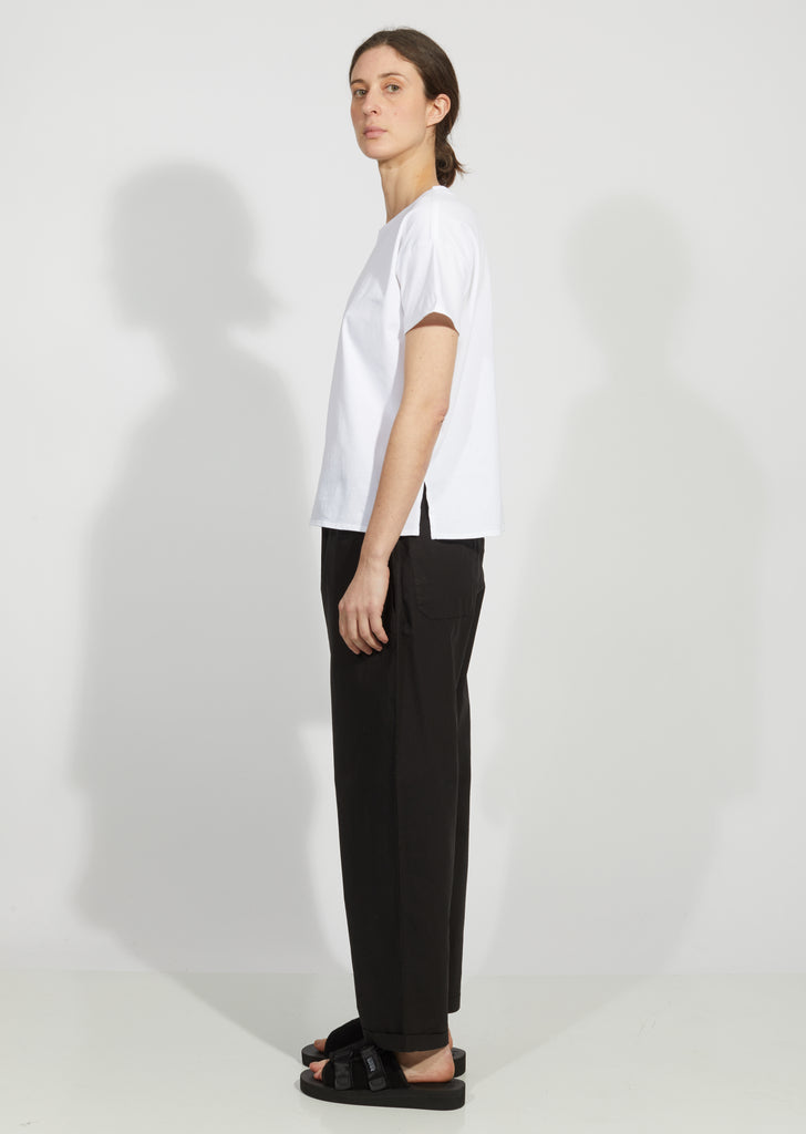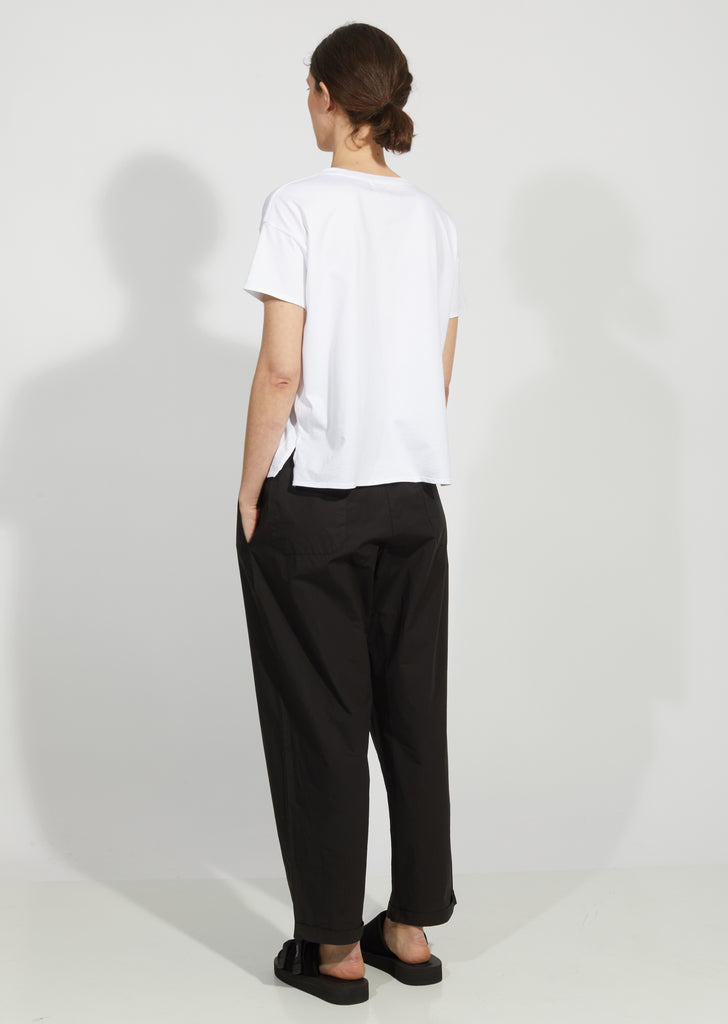 • crewneck; drop shoulders; side-seam slits; straight hem