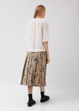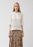 Boxy half-sleeve polo shirt crafted from écru silk-wool crêpe. Pulls over. Spread collar. Three-pearlized-button placket; button-and-loop closure. Side-seam slits. Back shoulder yoke; gathering at center. Straight hem falls to lower hip. Slightly sheer textile. Relaxed fit.