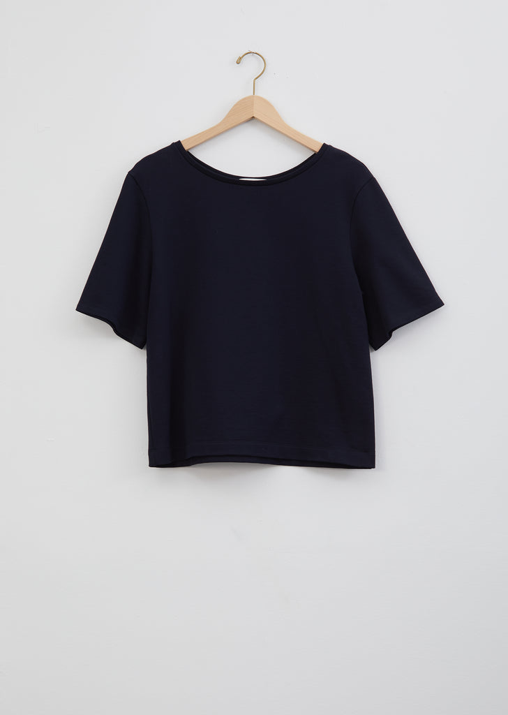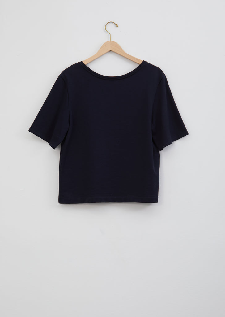Deep-navy T-shirt in plush Japanese cotton terry jersey, imagined with wide, elongated short sleeves and a boxy silhouette. Made in small batches in Japan.