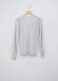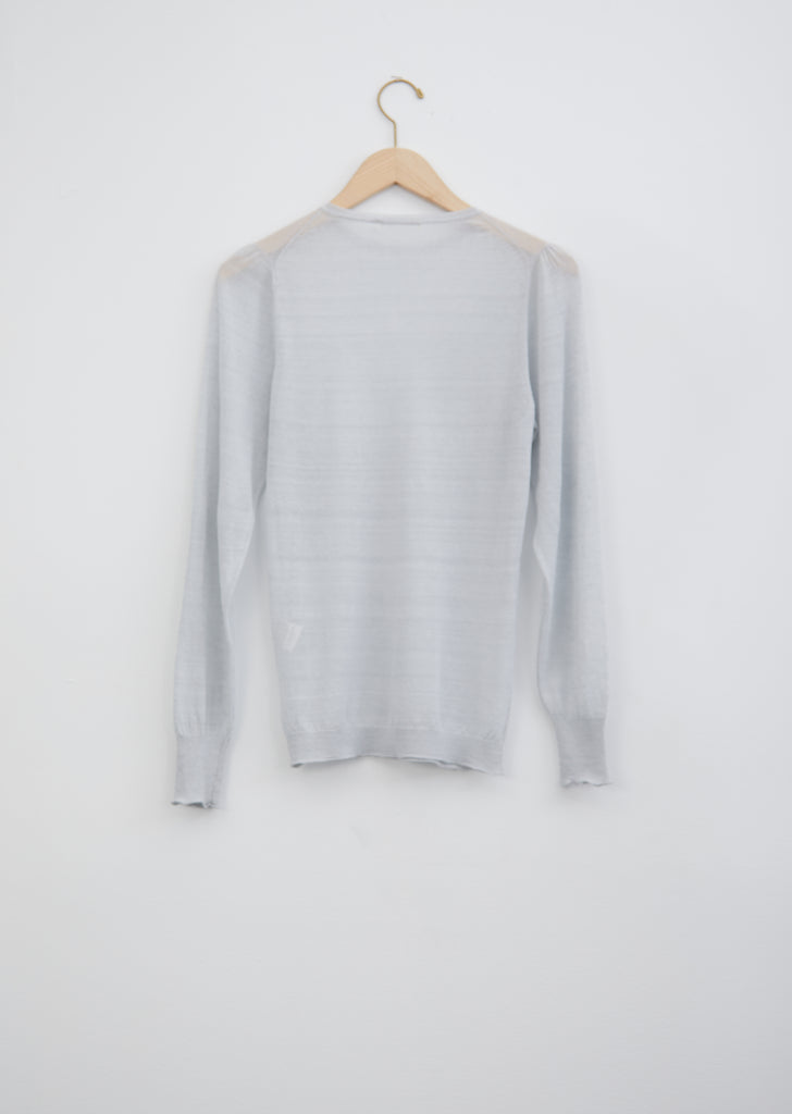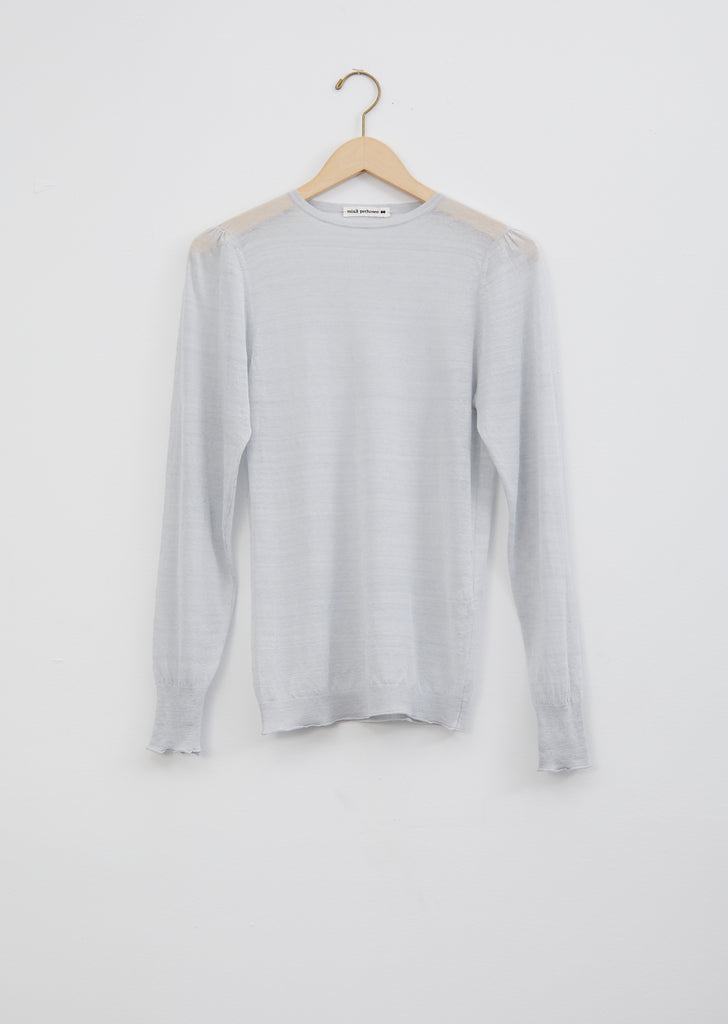 Minä Perhonen Miraggio Top in light grey gauzy knit, crafted in 100% Cotton. This summer knit features a slightly wider sleeves at top with small shirring on the shoulders and a ribbed trim at neckline, and sleeves. The bottom ribbed hem has a small roll effect.