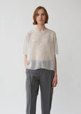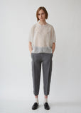 A silken T-shirt-style top with an all-over abstract-mountaintop design. (Umi means "sea" in Japanese). From the Japanese house of Minä Perhonen, whose design philosophy states that beautifully produced clothes should stand the test of time. Relaxed fit. Round neck with keyhole detail at back. Dropped short sleeves with slight puffing.