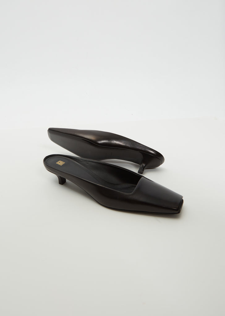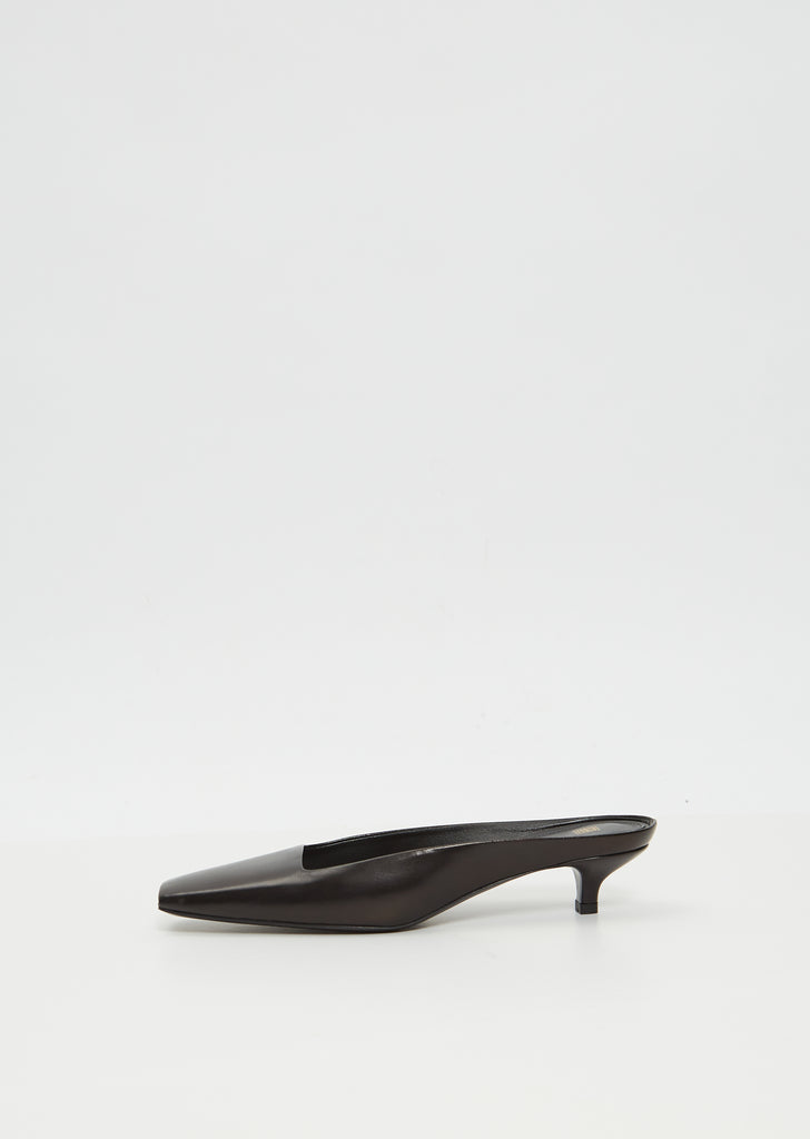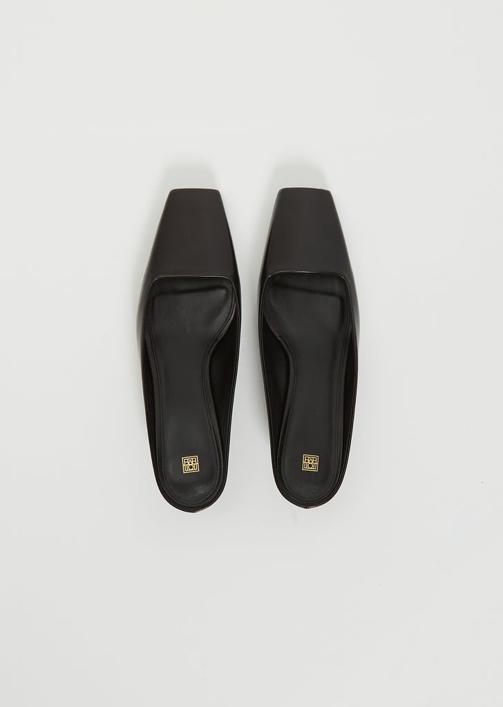Totême black square-toe mule with a discreet opening and a kitten heel in a smooth goat leather.