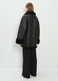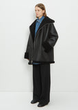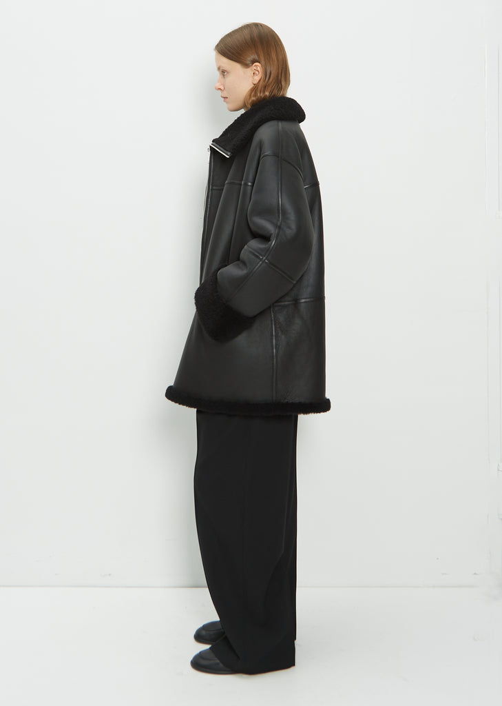 Totême black signature oversized shearling jacket with a high-standing collar, panel detailing and large zipper fastening in a sheep leather and shearling.