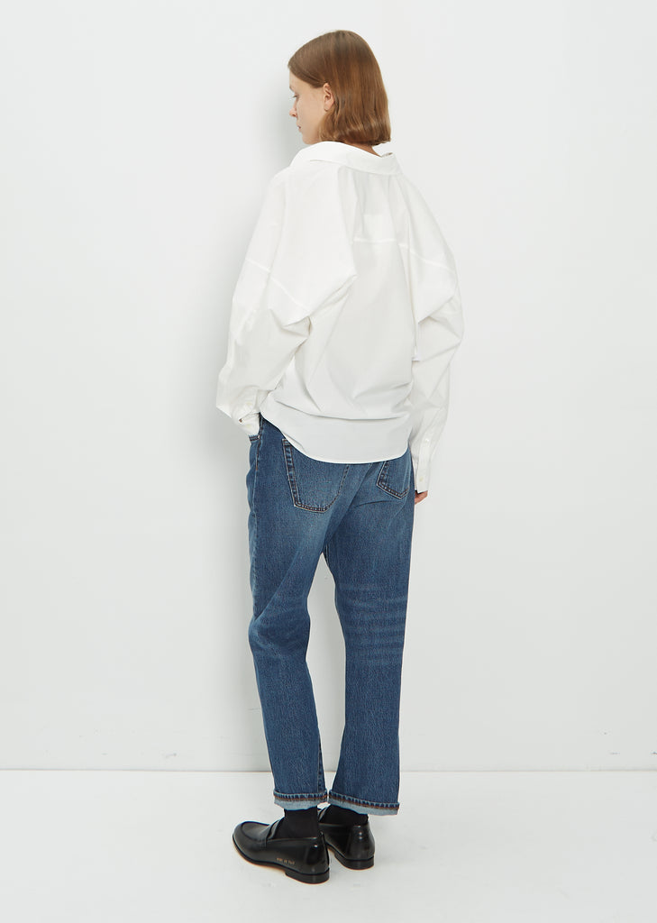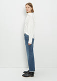 Totême classic washed blue straight-leg denim pant with a twisted seam at the leg in a structured and rigid organic cotton.