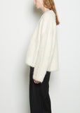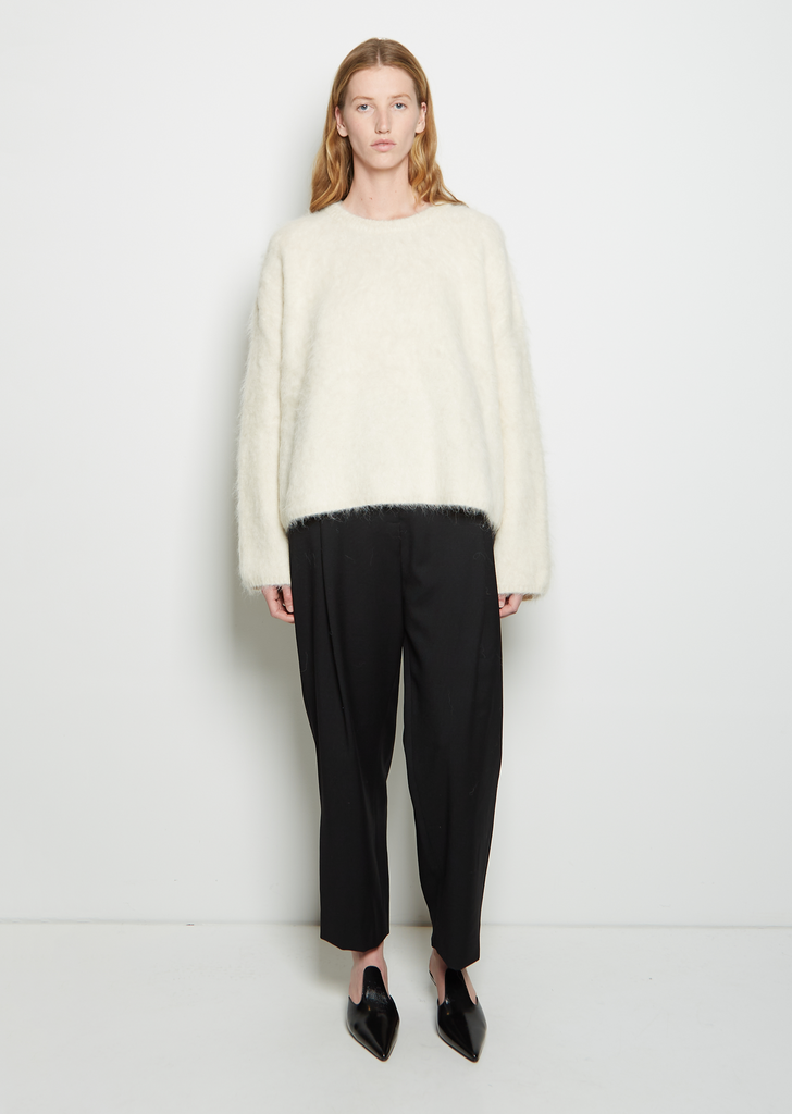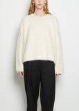 Totême relaxed fit wide crewneck sweater in light, fluffy alpaca knit. Finished with a ribbed neckline, dropped shoulders and elongated sleeves. Straight hem.