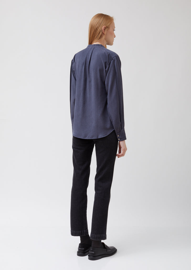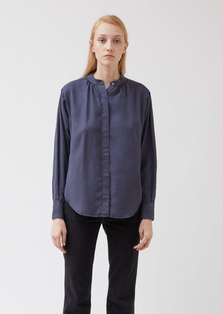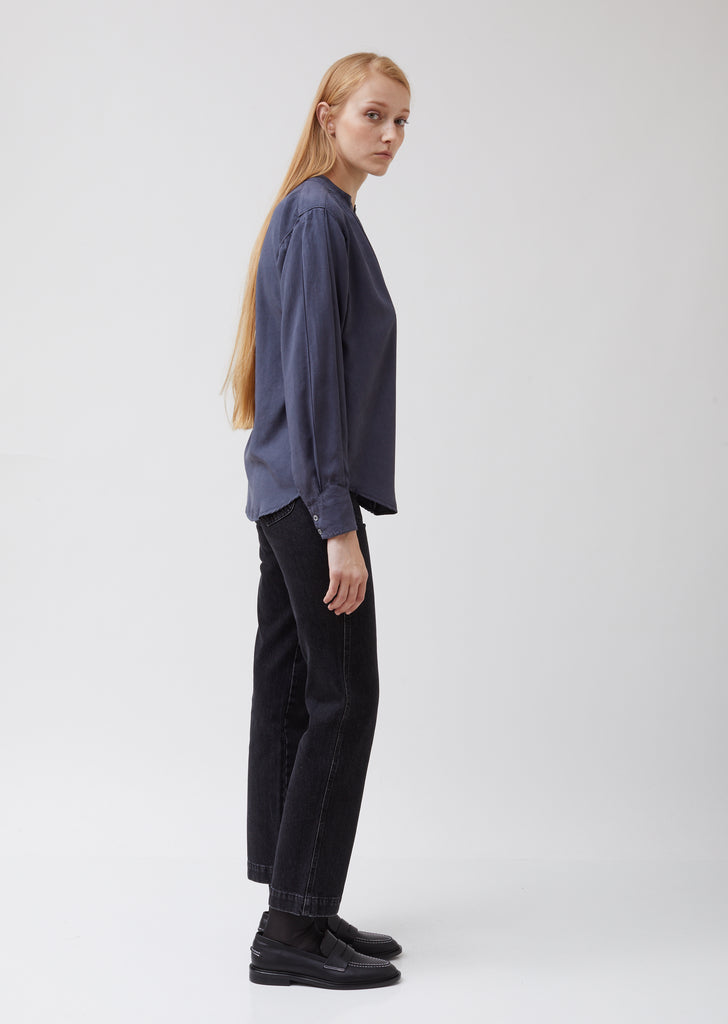 Henley-inspired concealed-button-front shirt, pigment-dyed in black and twill-woven from eco-friendly Lyocell fabric. Band collar with tonal button closure. Gentle gathering at neckline; single box pleat at back. Saddle shoulders. Long sleeves with box-pleating at sides. Two-button barrel cuffs. Shirttail hem. Relaxed, slightly boxy fit.