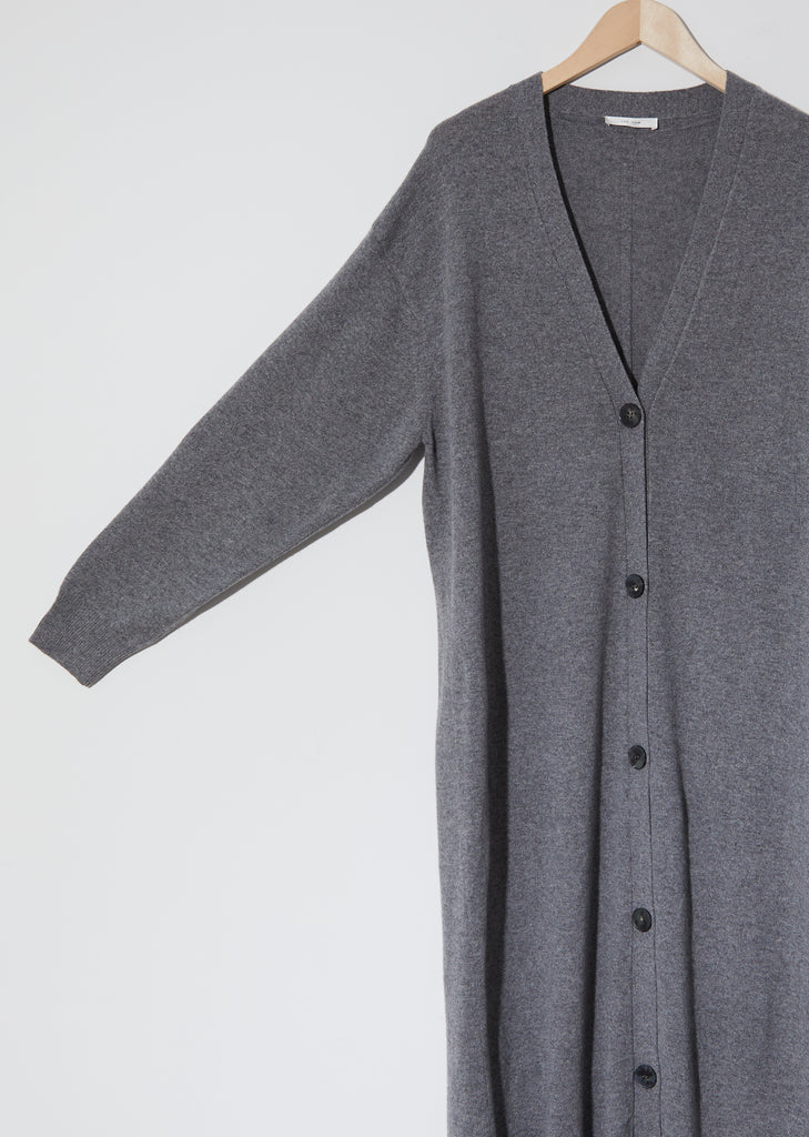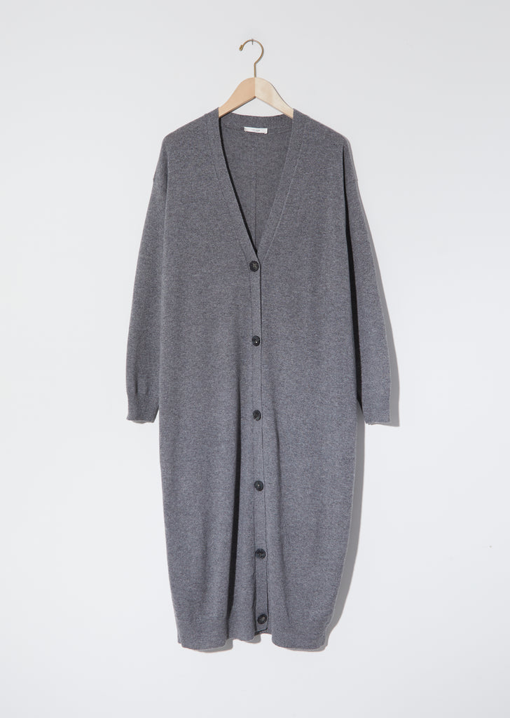 The Row Armando Cashmere Long Cardigan in Dark Grey Melange. Crafted in all cashmere, long V-neck cardigan with an oversized fit and shaped, long sleeves.