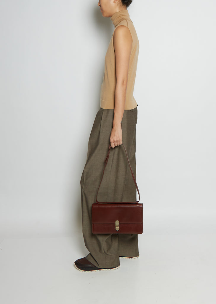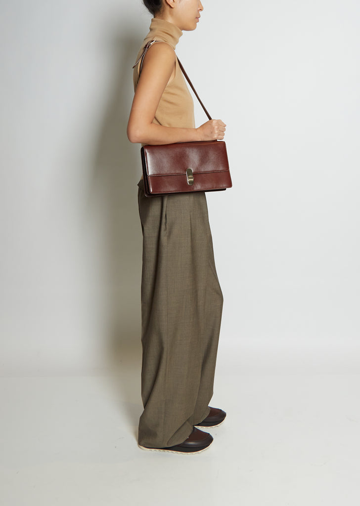 The Row classic rectangular flat baguette bag in soft calfskin leather with soft folded gussets and turnstile lock closure. Adjustable Shoulder Strap.