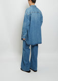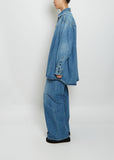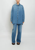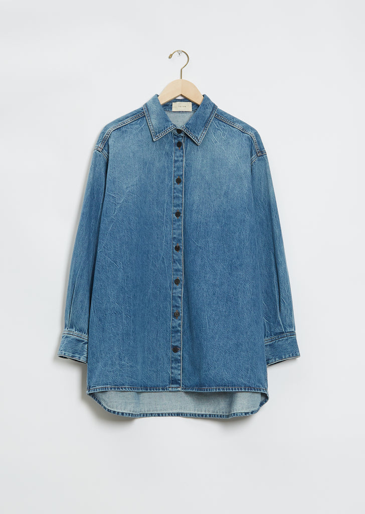 The Row blue oversized, menswear-inspired button up shirt in garment dyed cotton denim with horn buttons and curved shirttail hem.